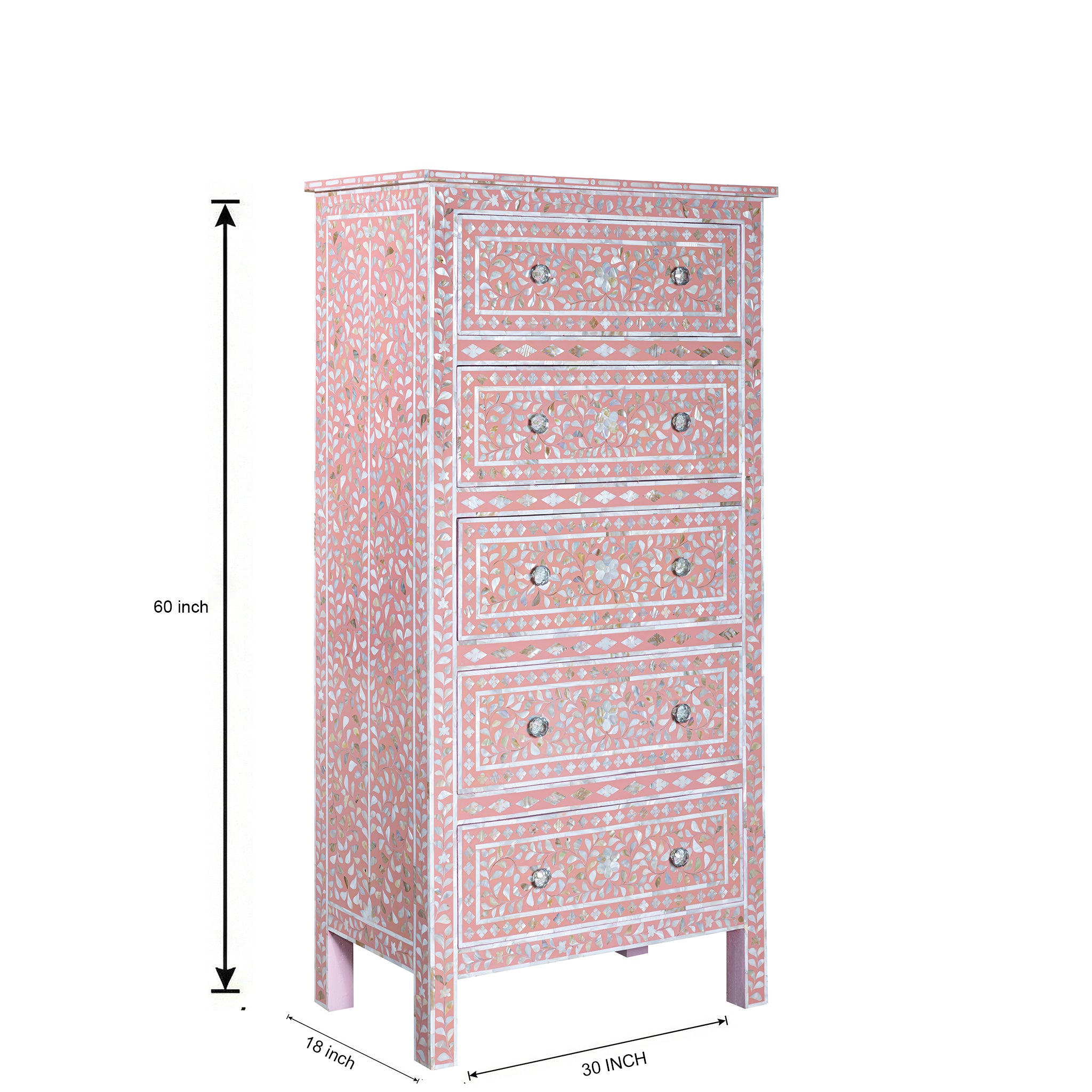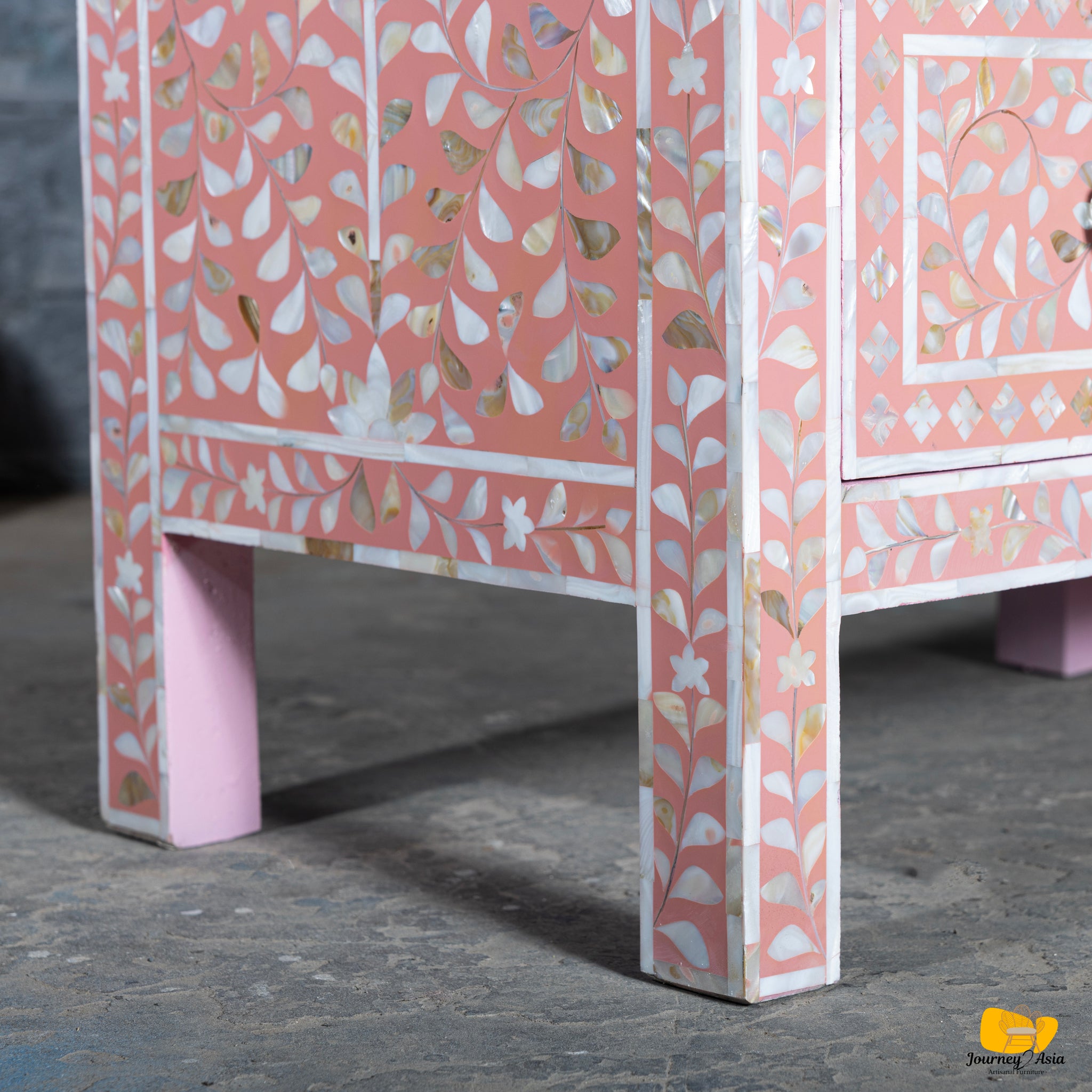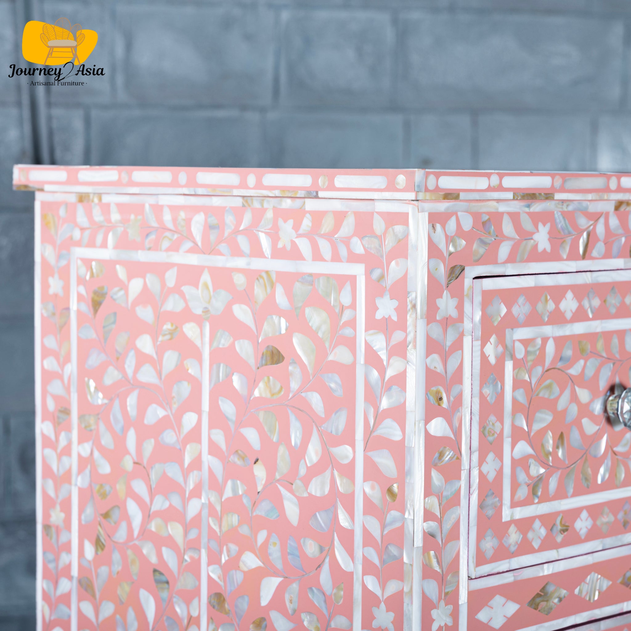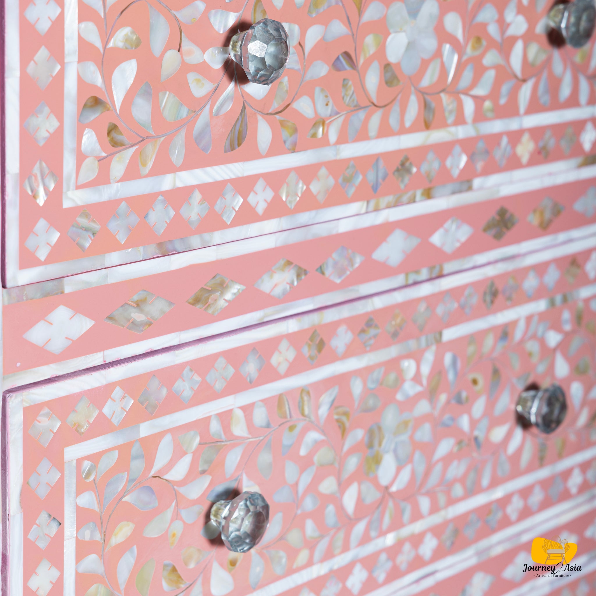Add refined elegance and handcrafted luxury to your home with this stunning Mother of Pearl (MOP) Inlay Dresser, featuring a soft blush-pink base and intricately detailed floral patterns. Each piece of shimmering shell is hand-cut, hand-placed, and polished by skilled artisans - creating a breathtaking mosaic that glows beautifully under natural or ambient light.