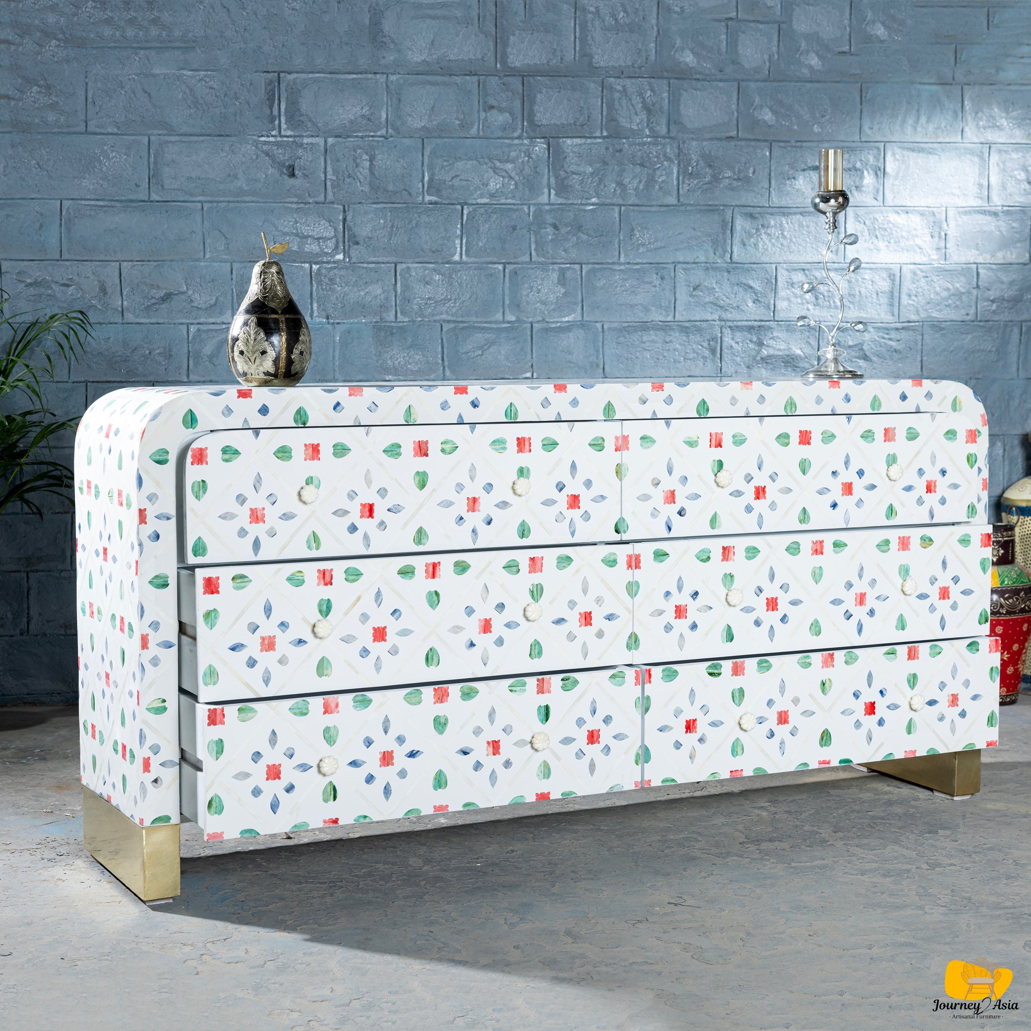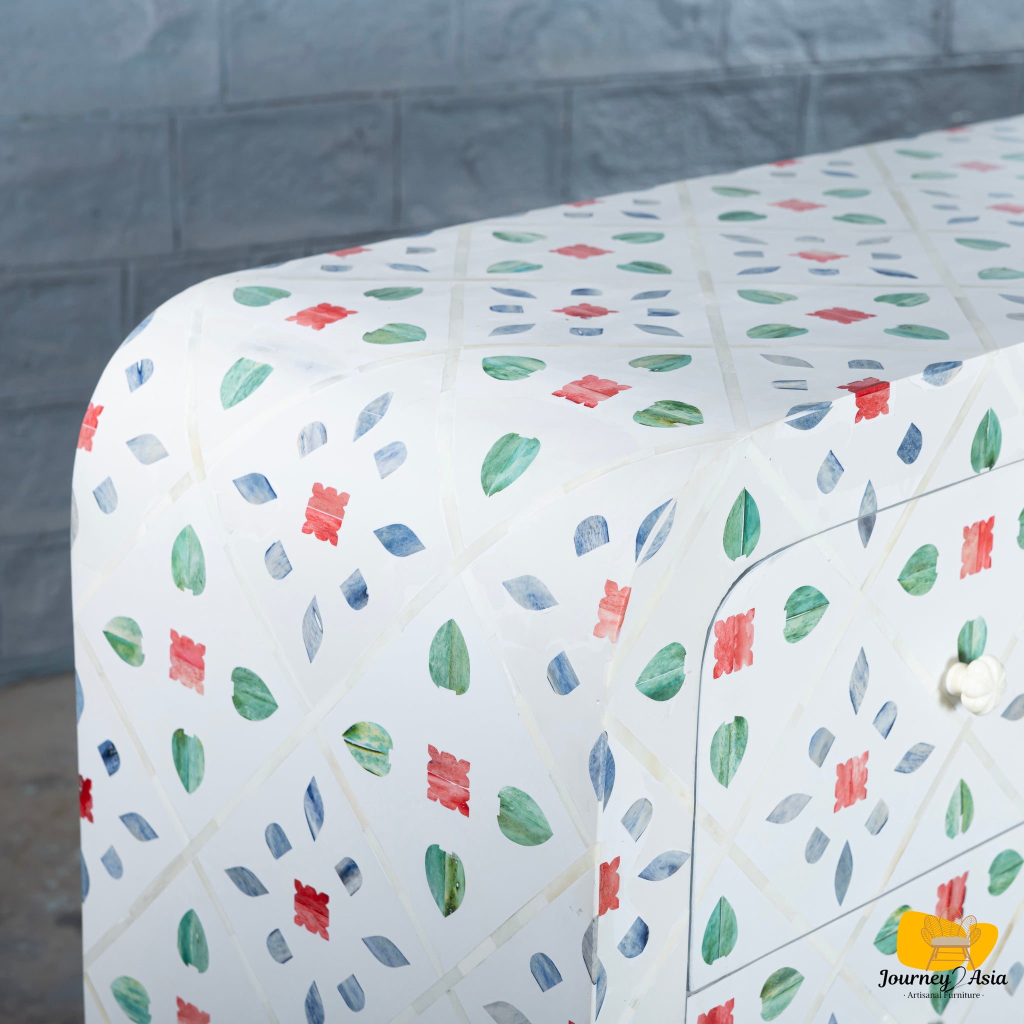 Elevate your home with this exquisite Bone Inlay Console Table, inspired by the rich artistic heritage of the Peranakan culture. Peranakan (also known as Straits Chinese) refers to a vibrant Southeast Asian community celebrated for its colorful art, ornate motifs, and exquisite craftsmanship. Their designs are known for blending Chinese, Malay, and Indonesian influences - resulting in bold colors, intricate florals, and geometric patterns that carry deep cultural meaning.