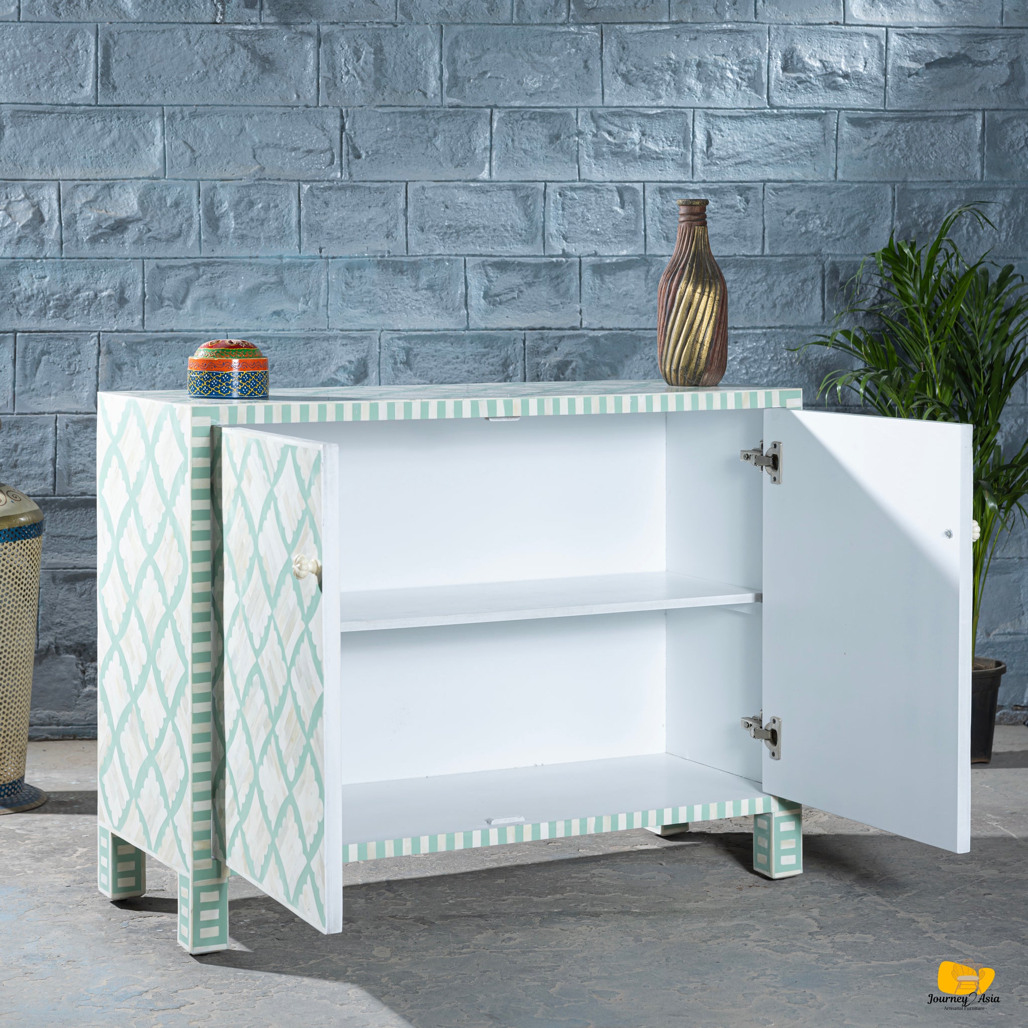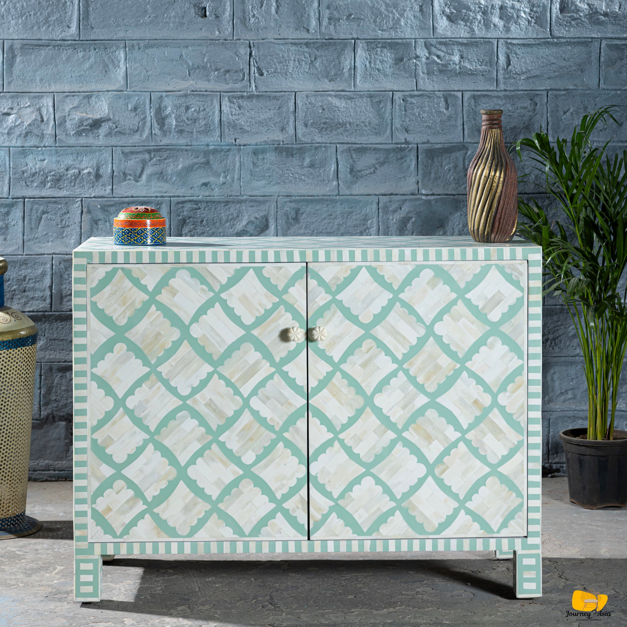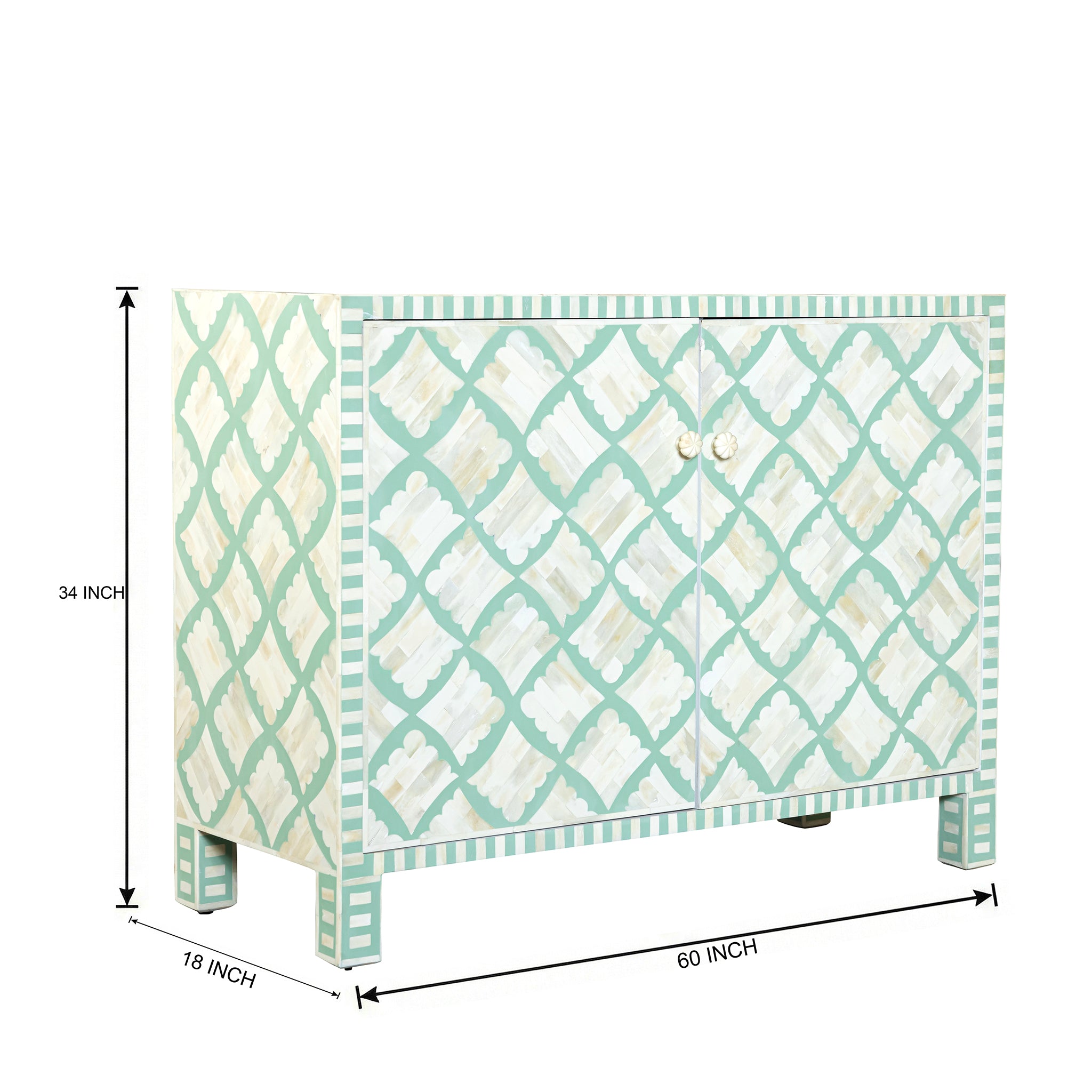 Brighten your space with this stunning Bone Inlay Cabinet, featuring a fresh green-and-white clover-inspired pattern that blends global craftsmanship with modern charm. Handcrafted with meticulous attention to detail, each piece of bone is individually cut and set into a smooth, eye-catching motif that adds both artistry and elegance to any room.