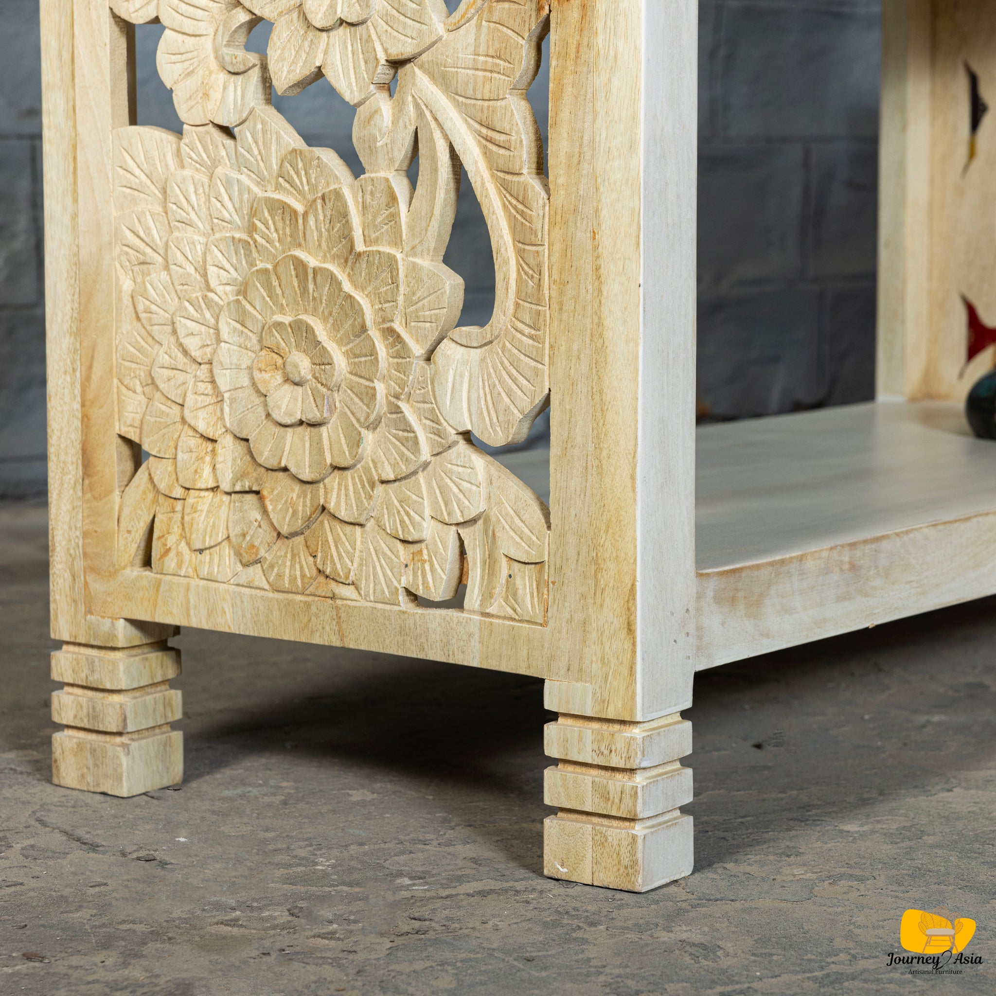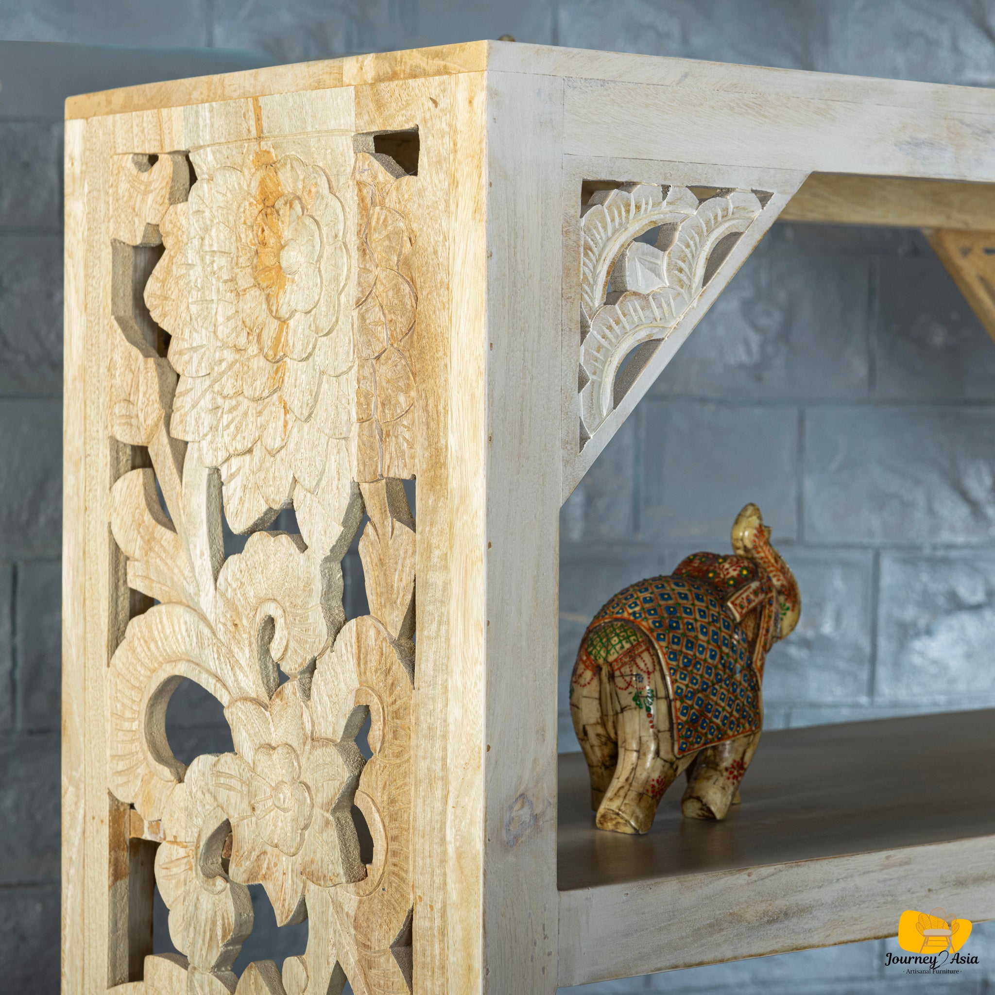 Introduce artisanal beauty and airy elegance to your home with this hand-carved mango wood open shelf, designed to function as both a display piece and an architectural focal point.