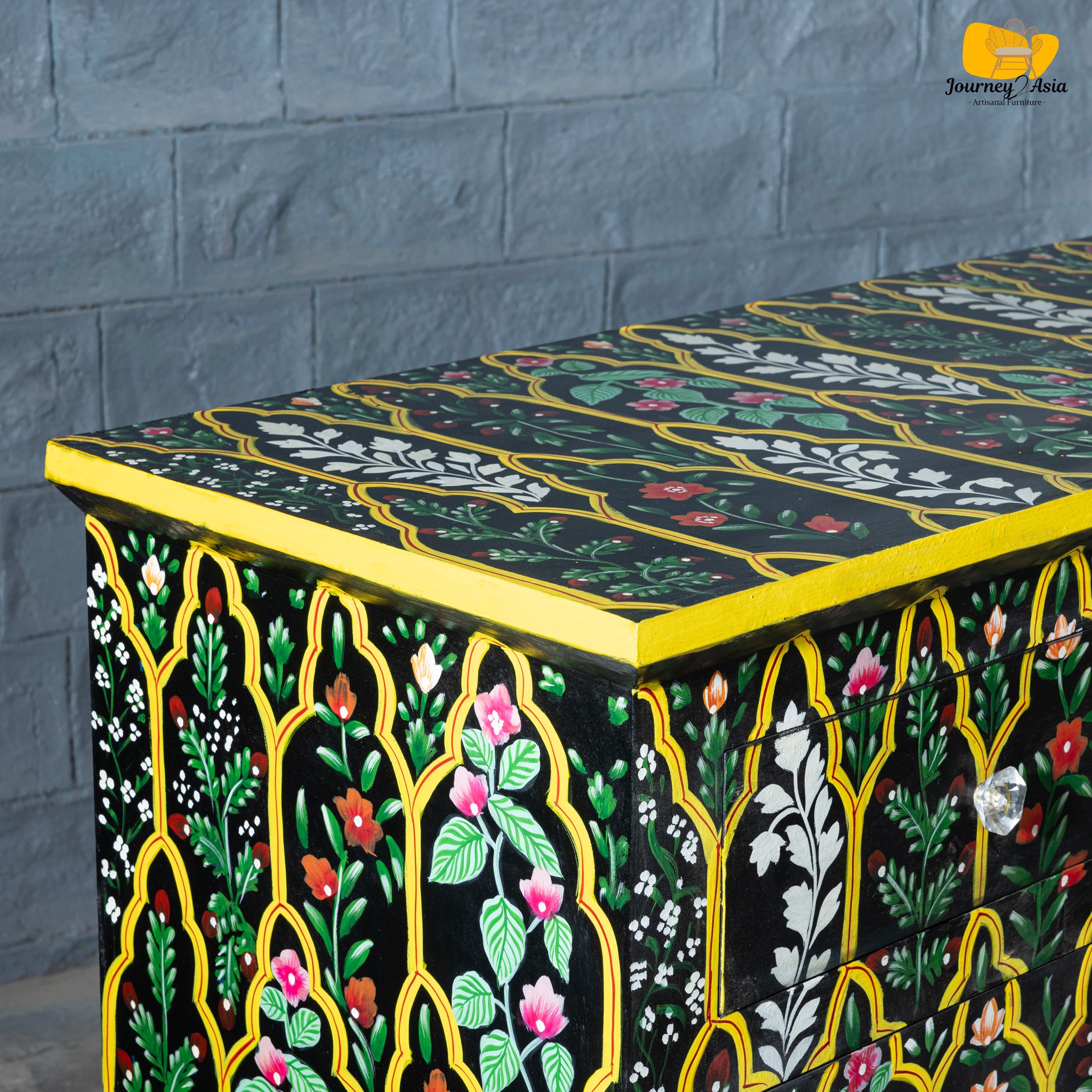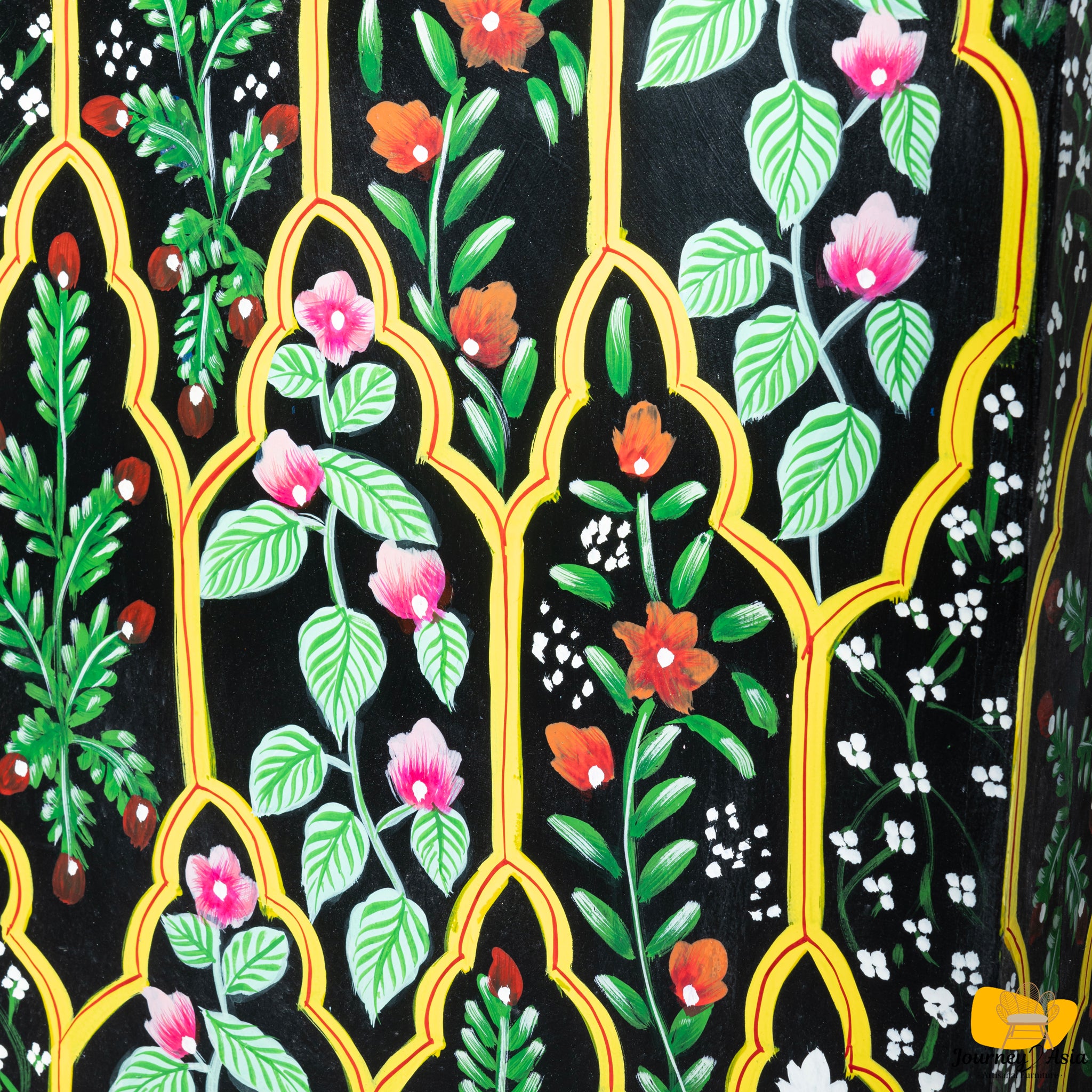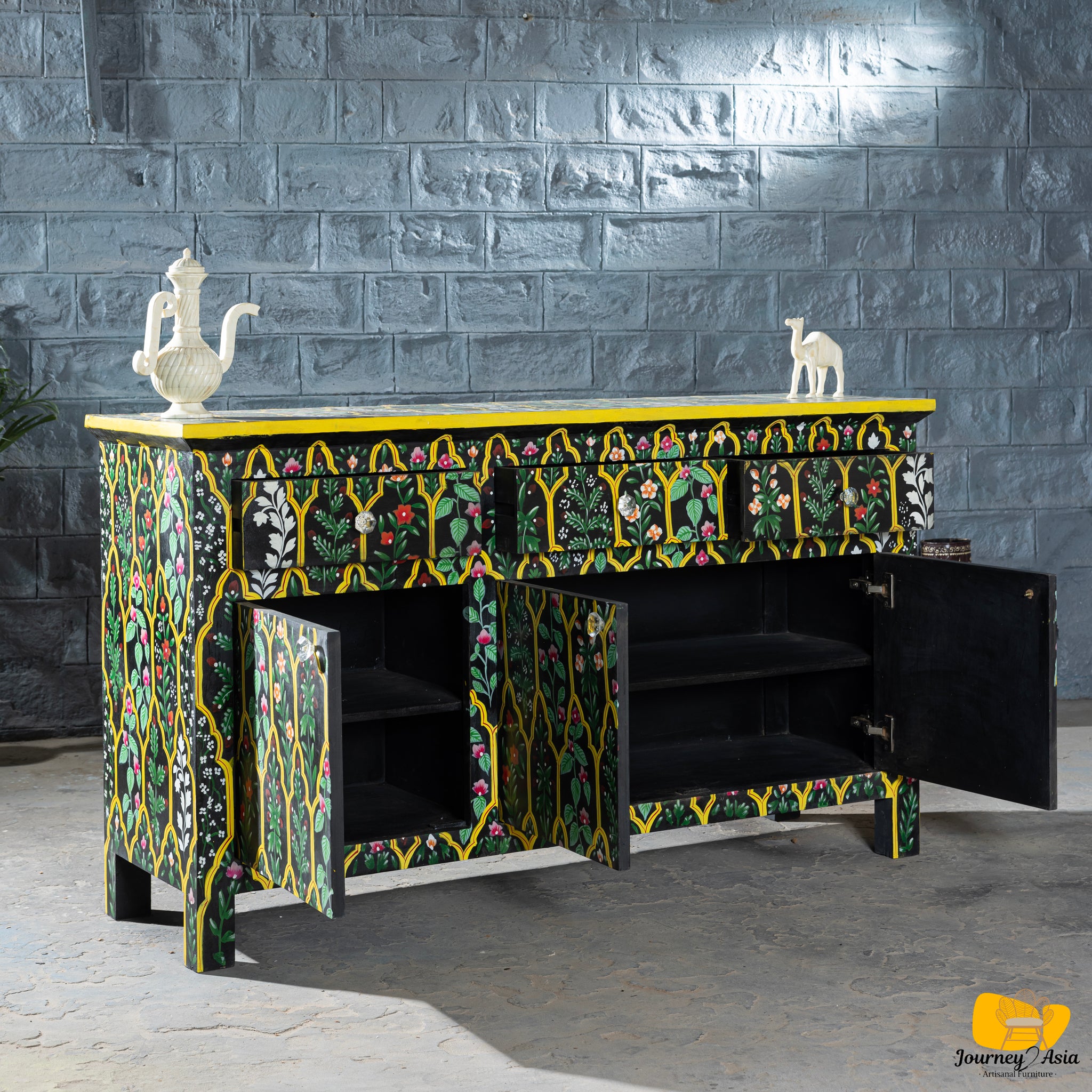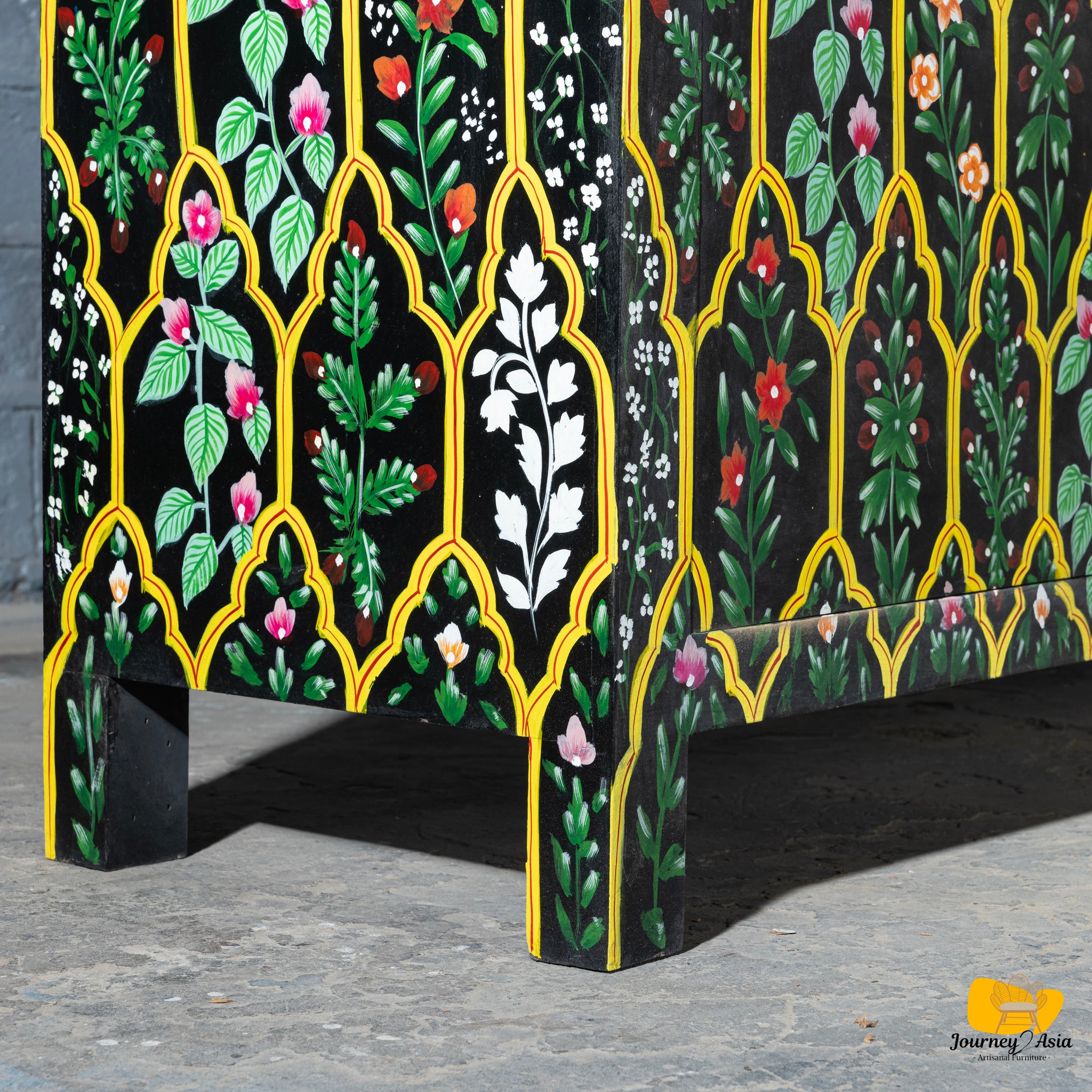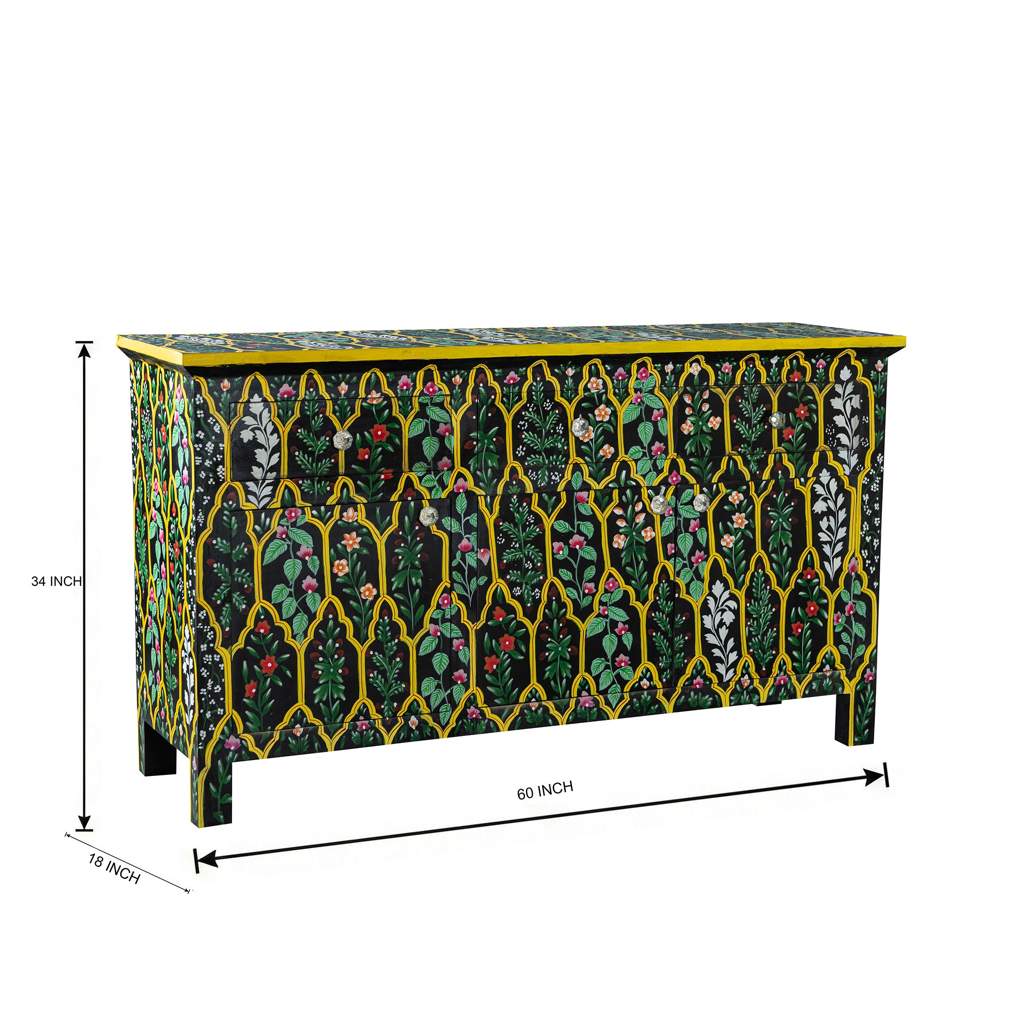 This 60-inch console features a rich black base lavishly decorated with intricate floral and vine motifs, meticulously hand-painted in vibrant hues of teal, pink, white, red, and green. Each floral panel is framed within a series of arched jali-style outlines inspired by Mughal and Rajasthani architectural windows - giving the piece an ornate, palace-inspired presence.