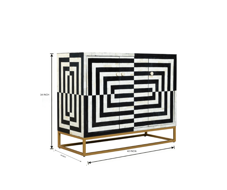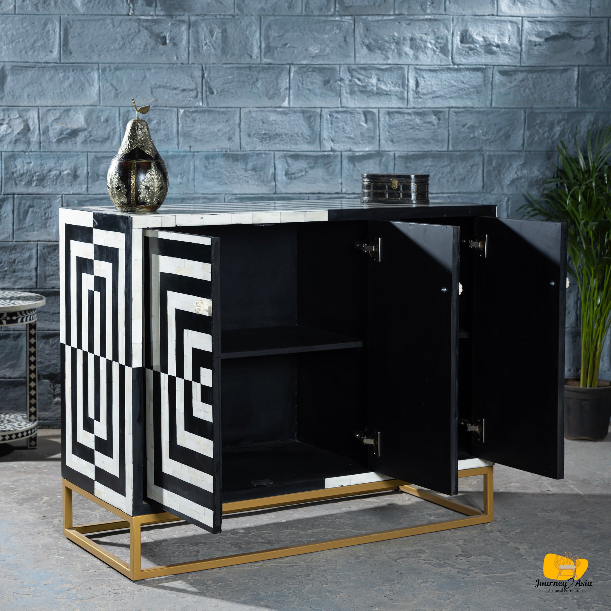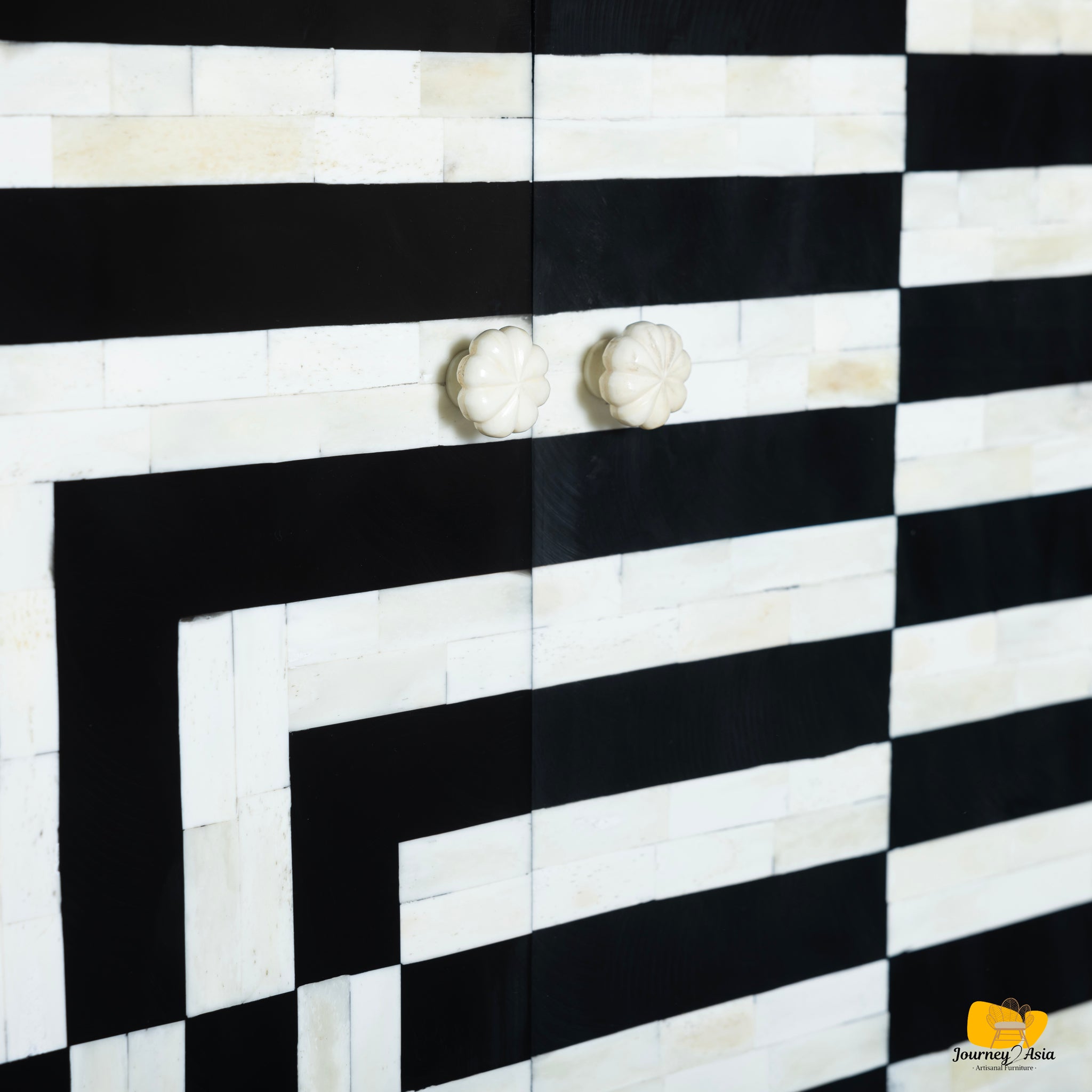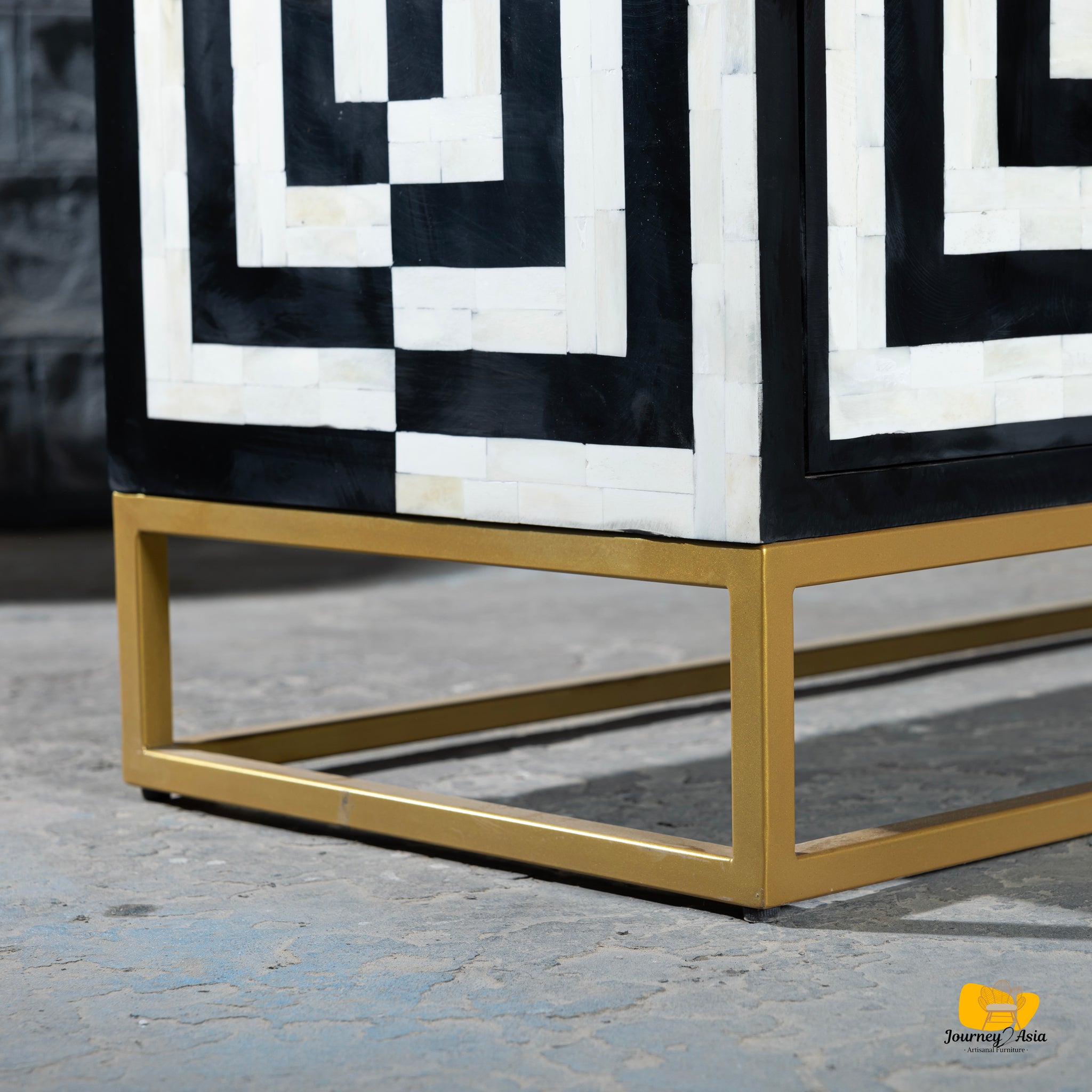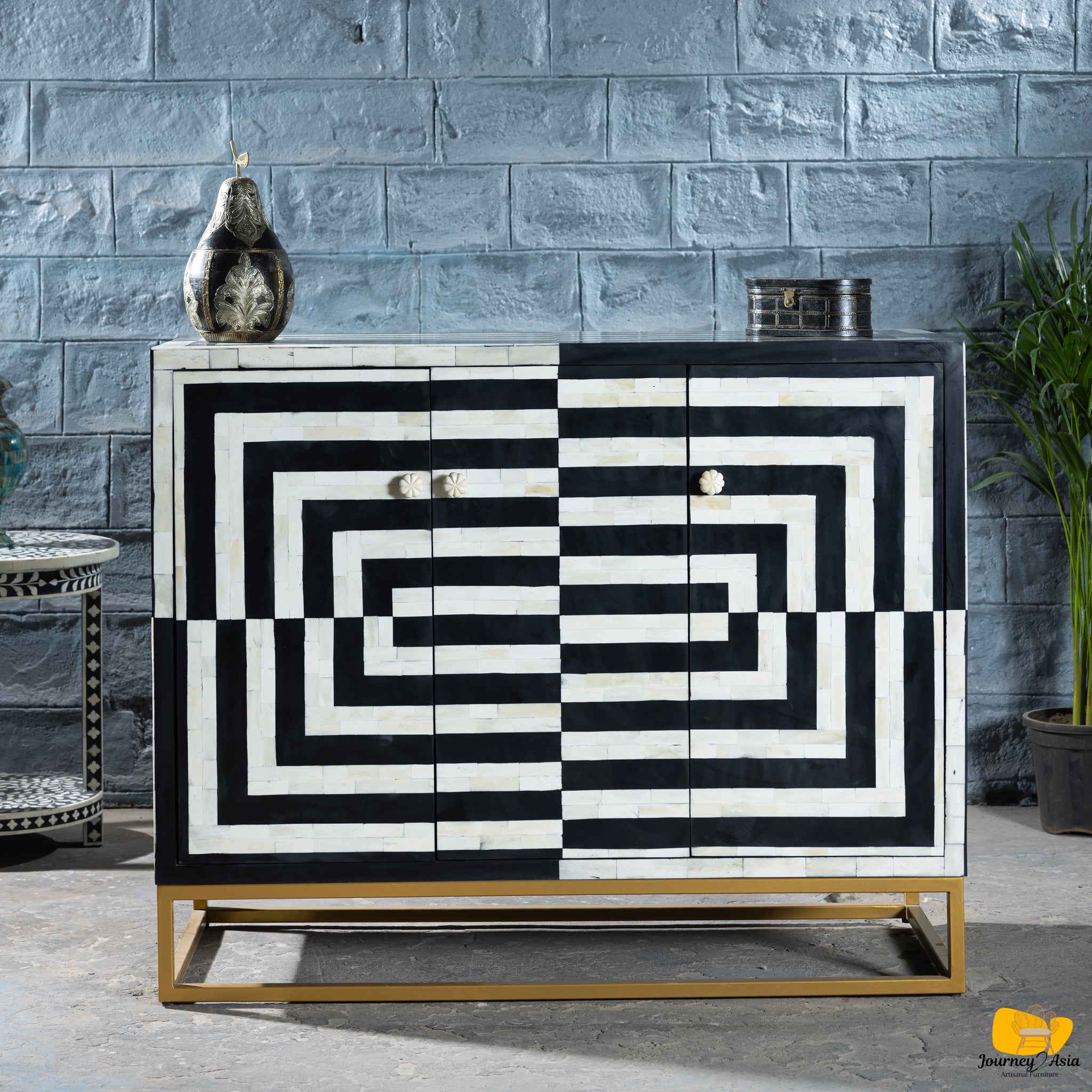 Make an unforgettable design statement with this bold and contemporary Modern Eclectic Bone Inlay Sideboard, featuring a striking geometric pattern crafted from individually hand-set bone tiles. With its dramatic black-and-ivory palette and hypnotic maze-inspired design, this piece transforms any space into a gallery-worthy interior.