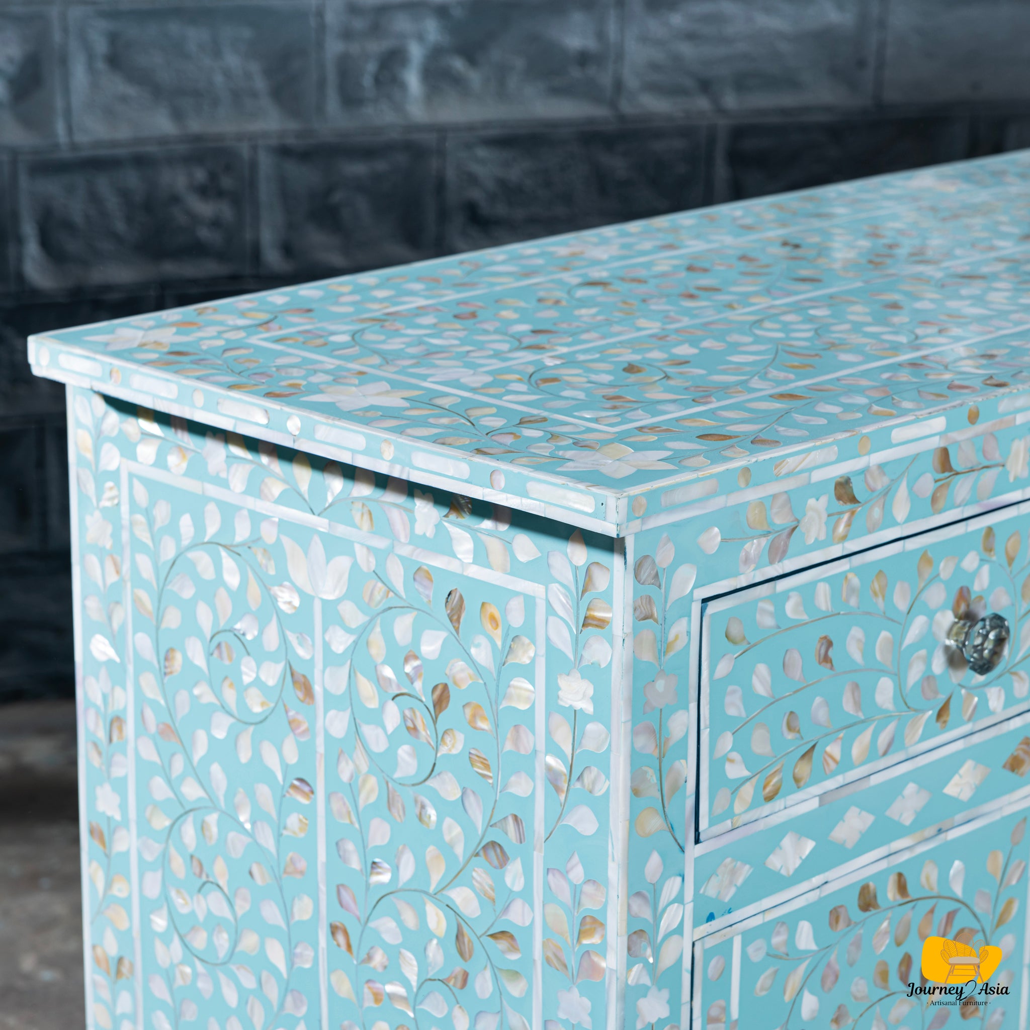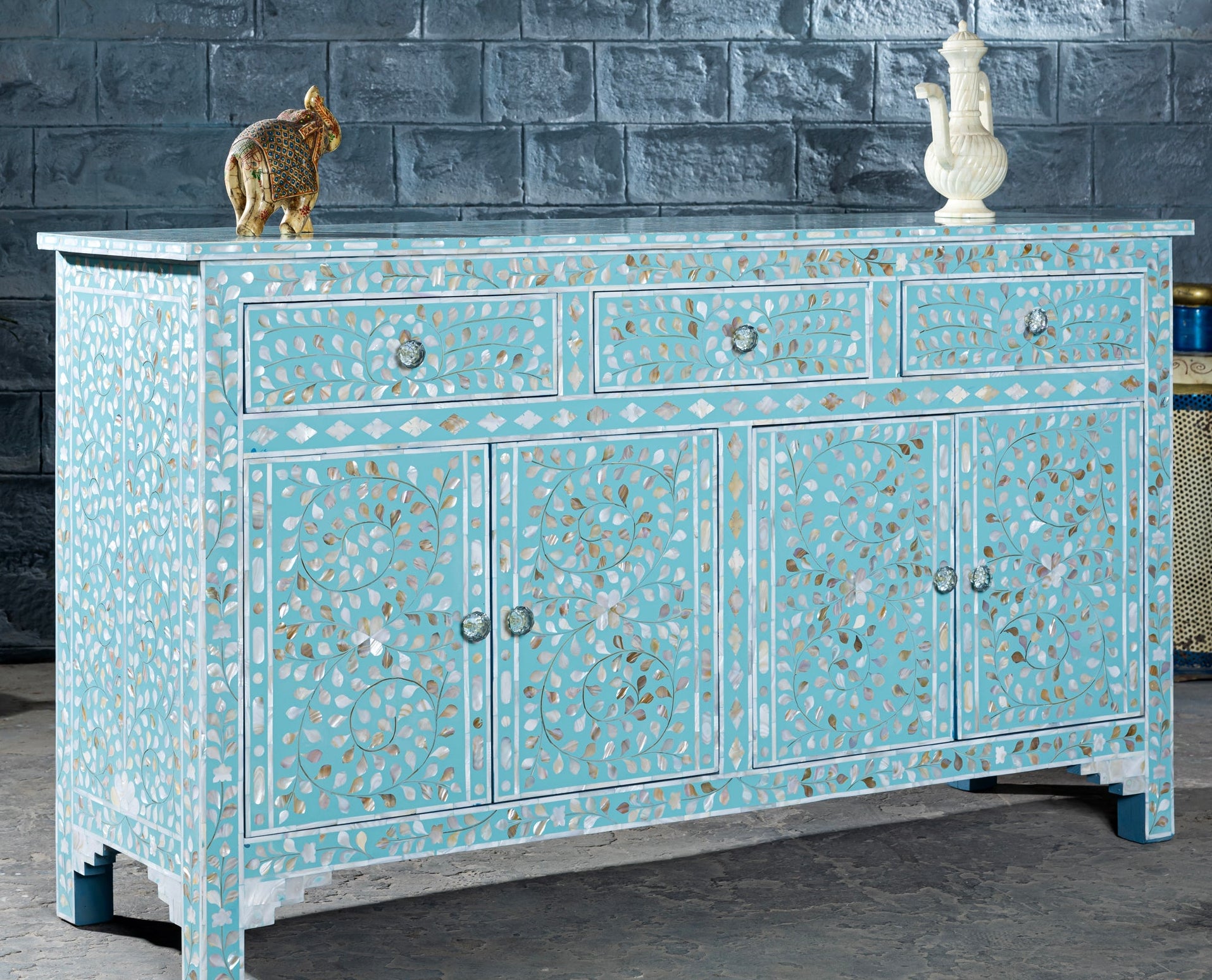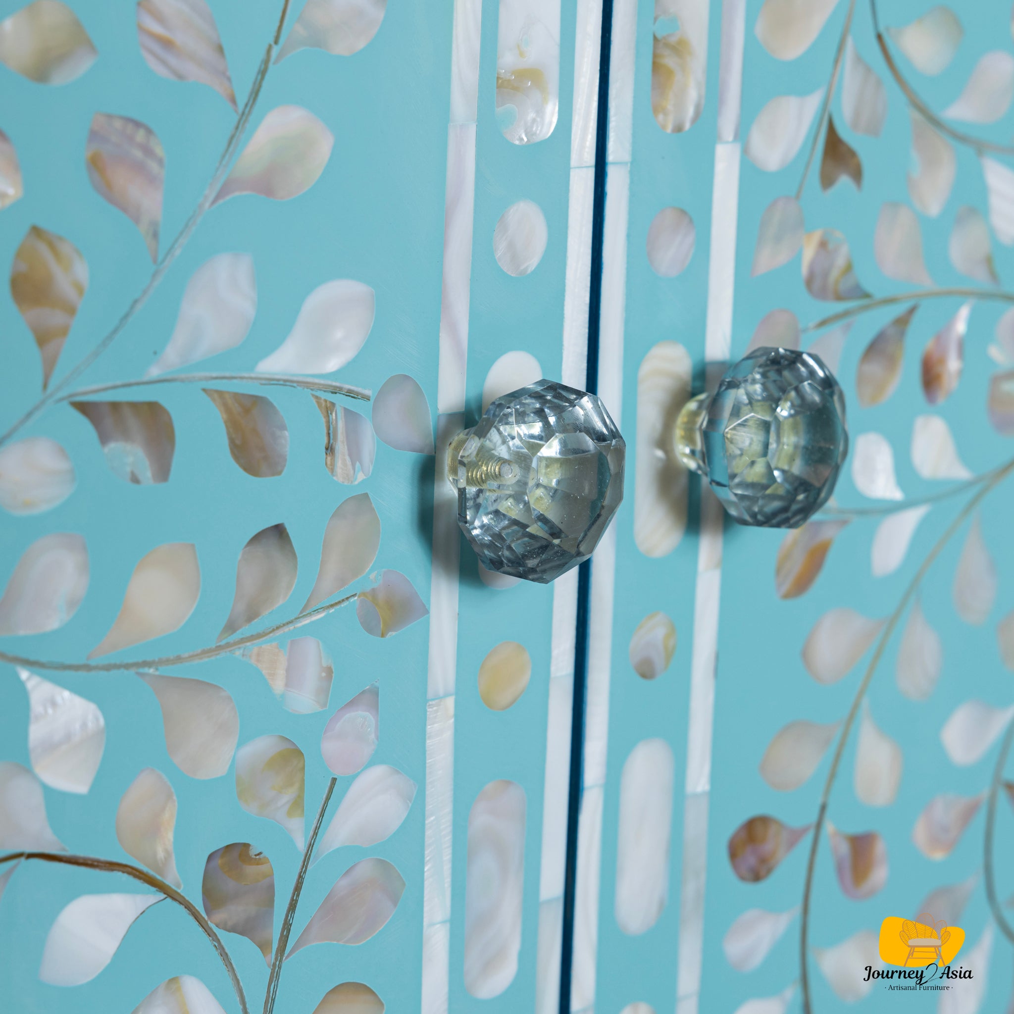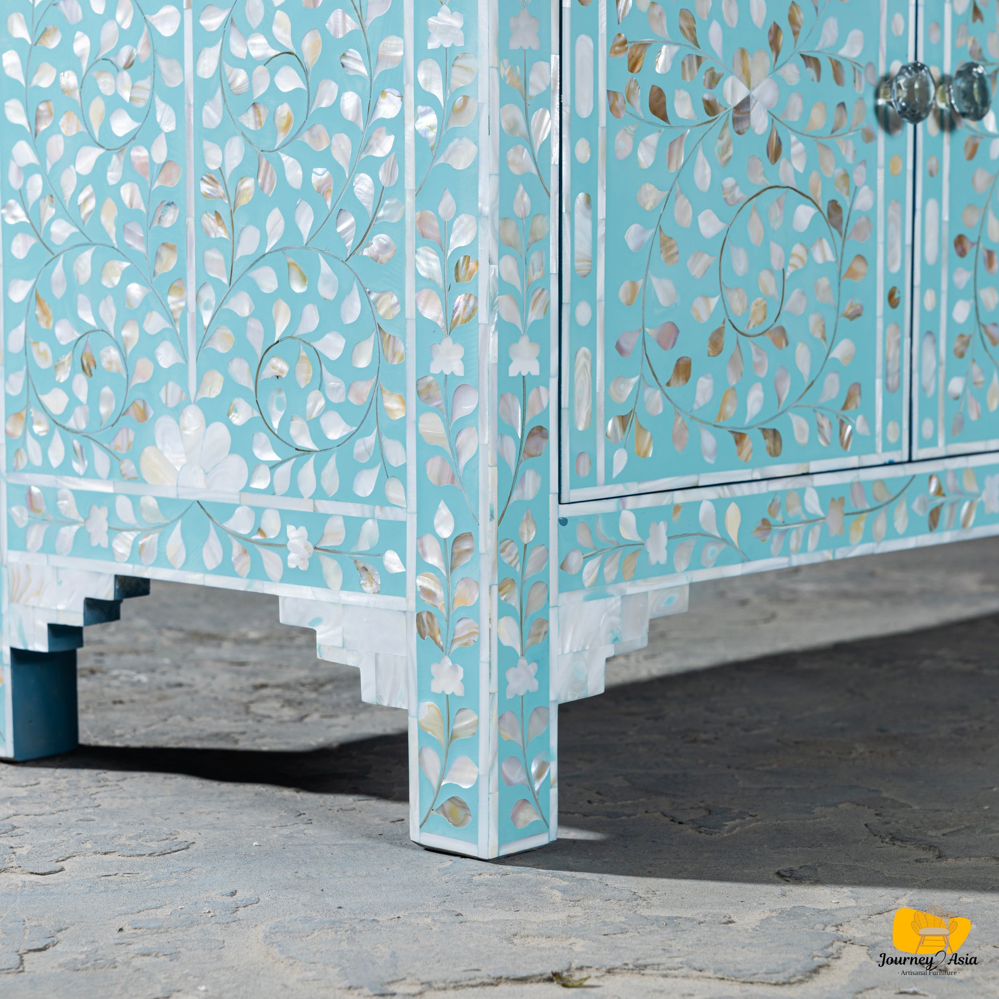 - Traditional floral inlay with modern sky-blue palette