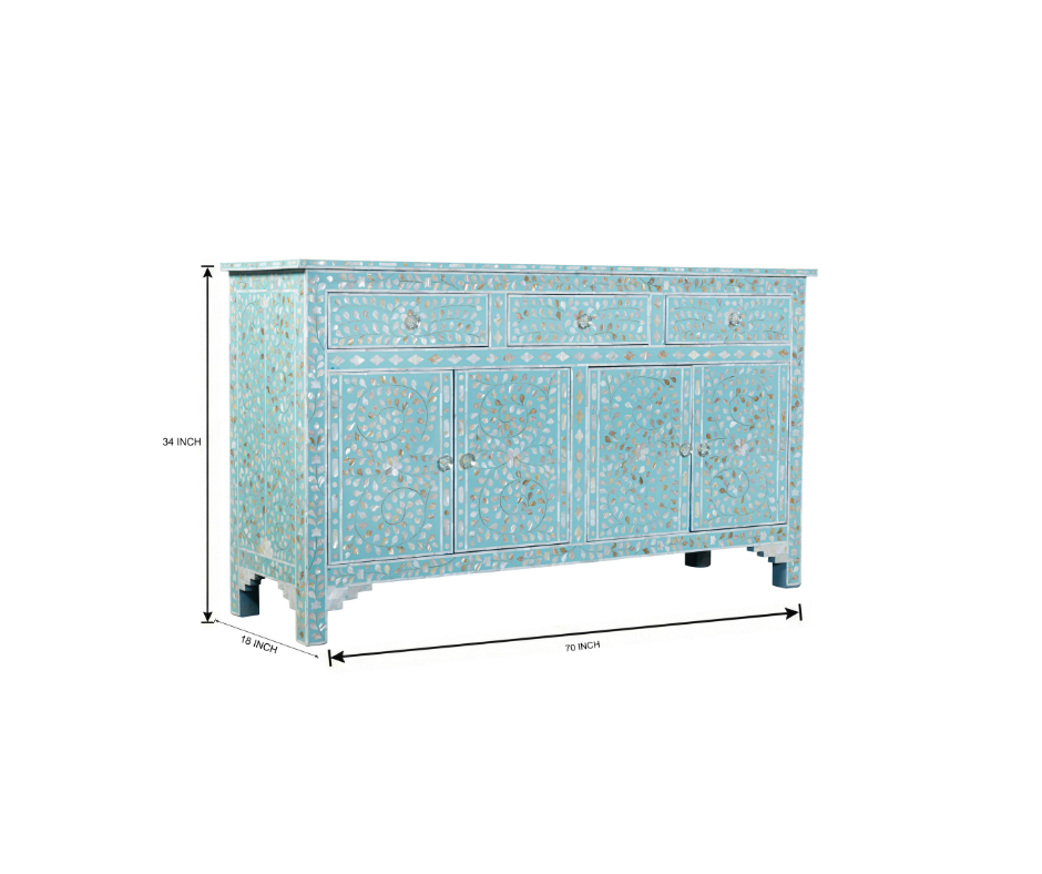 Bring elegance, artistry, and timeless craftsmanship into your home with this exquisite Mother of Pearl (MOP) Console Table, beautifully adorned with a soft sky-blue background and intricate floral inlay patterns. Every shimmering piece of shell is hand-cut and individually placed by skilled artisans, creating a breathtaking mosaic that reflects light with gentle iridescence.