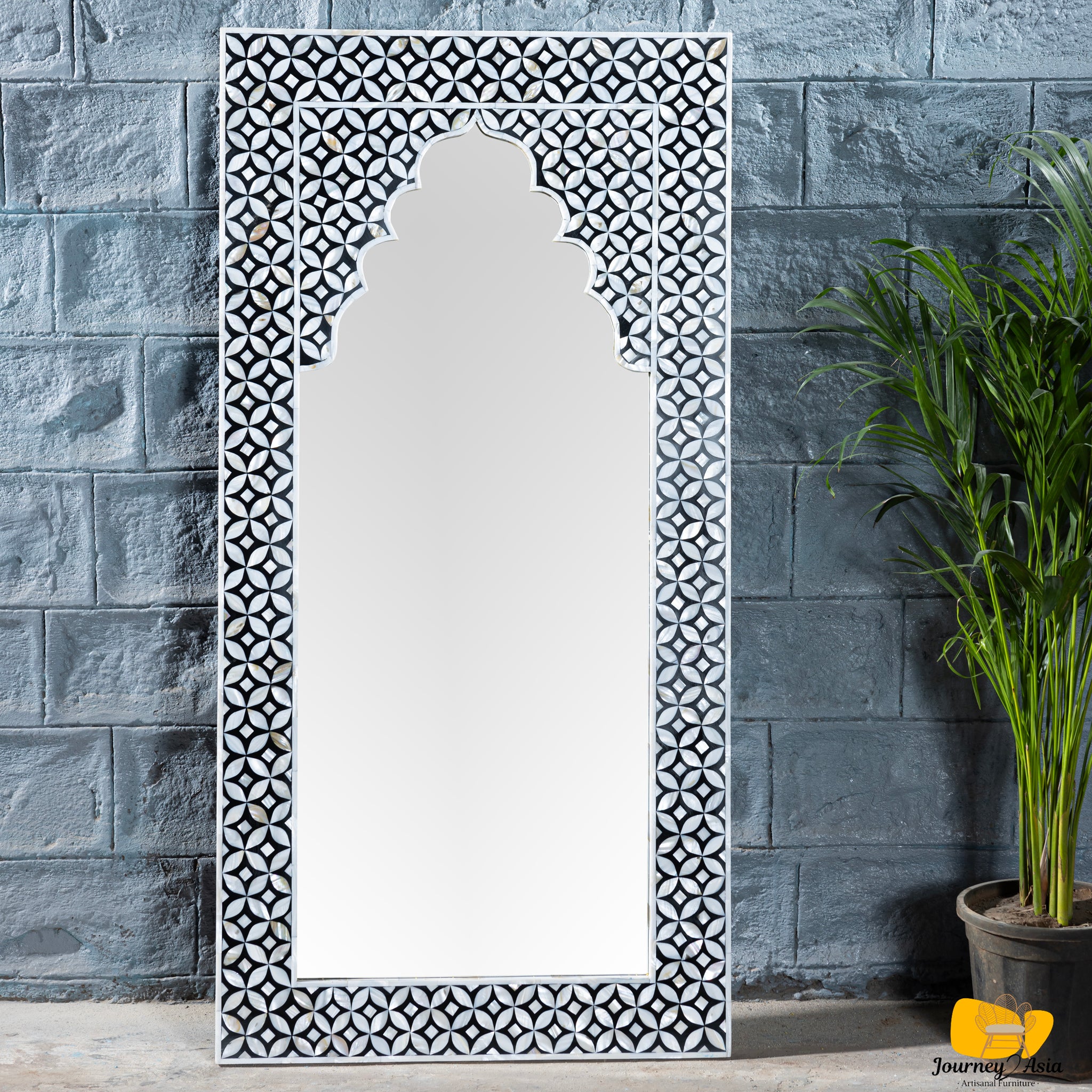 Elevate your home with the luminous beauty of this Mother of Pearl inlay mirror, crafted in a striking Moroccan arch silhouette. The intricate geometric pattern set against a deep navy background creates a mesmerizing play of iridescence and contrast.