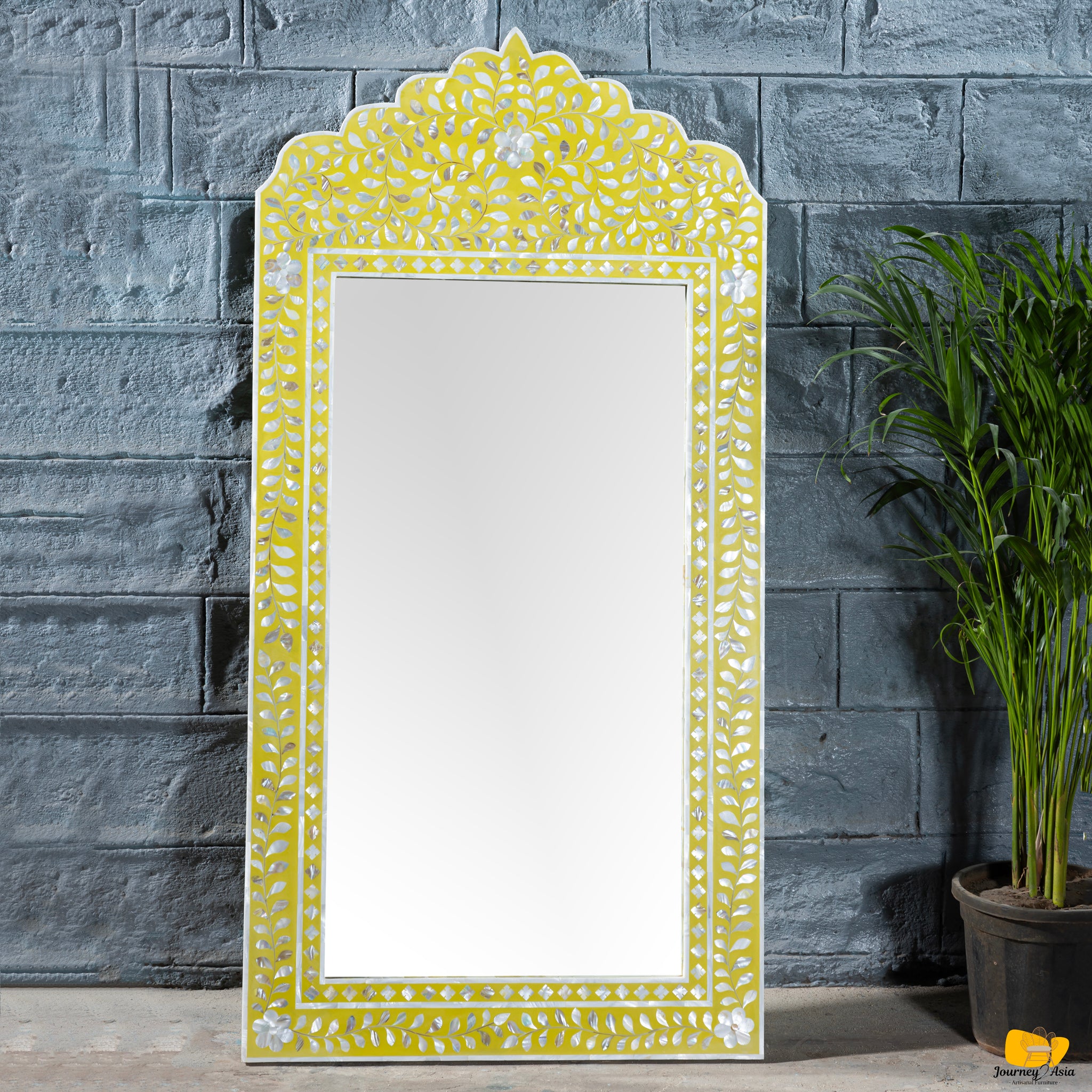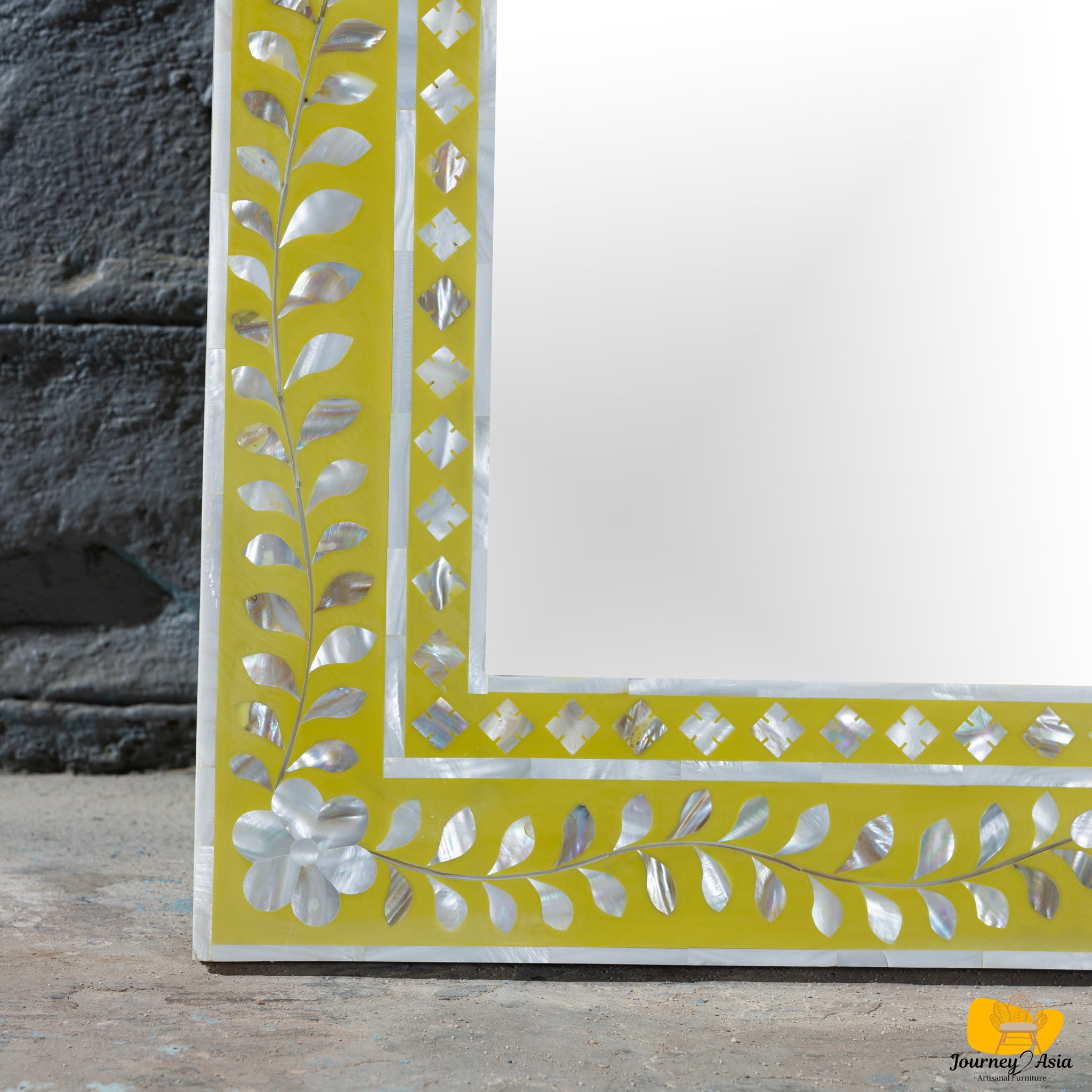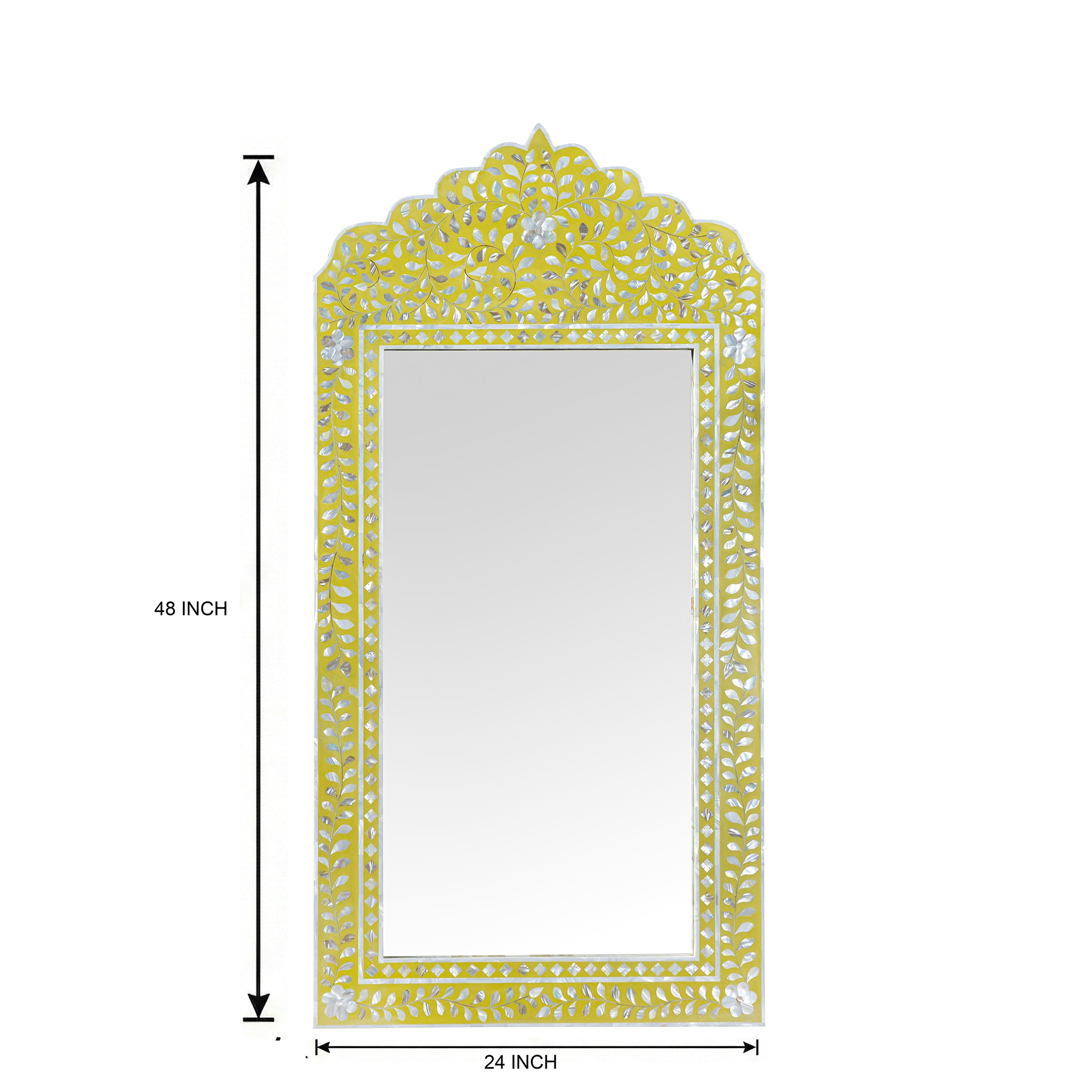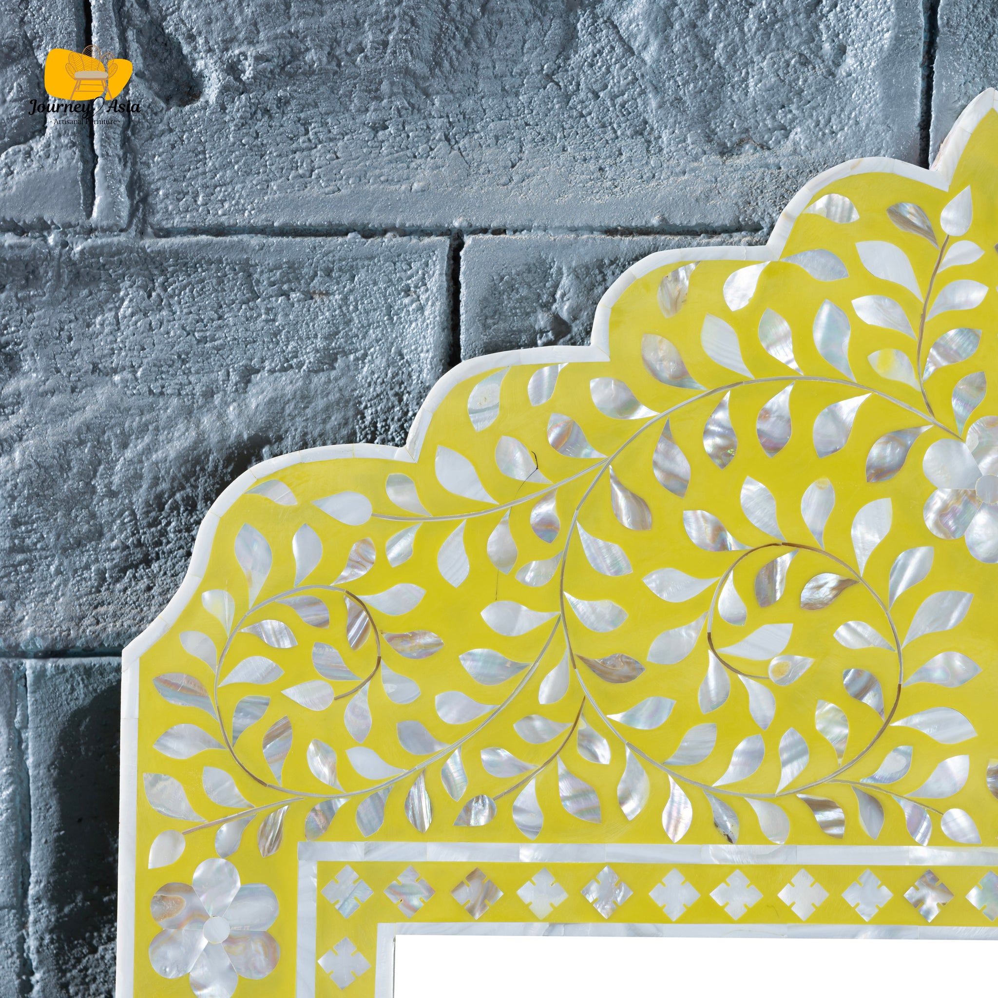 Brighten your space with the vibrant charm of this handcrafted MOP inlay arch-top mirror, featuring a joyful mustard yellow and ivory floral vine motif.