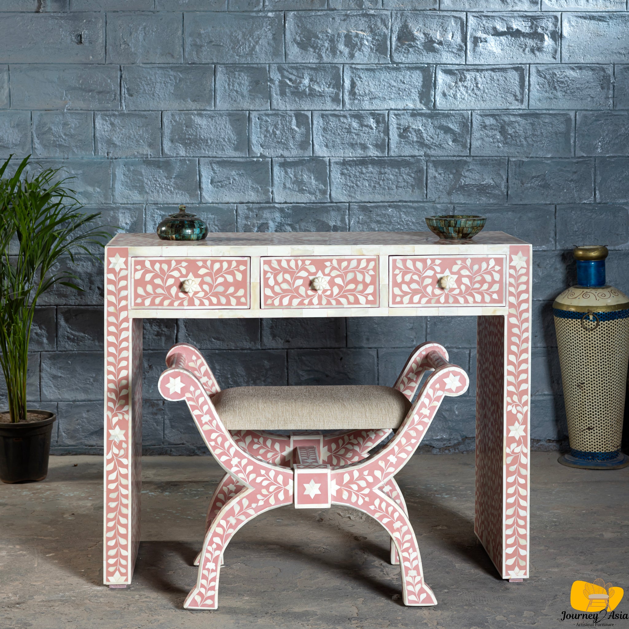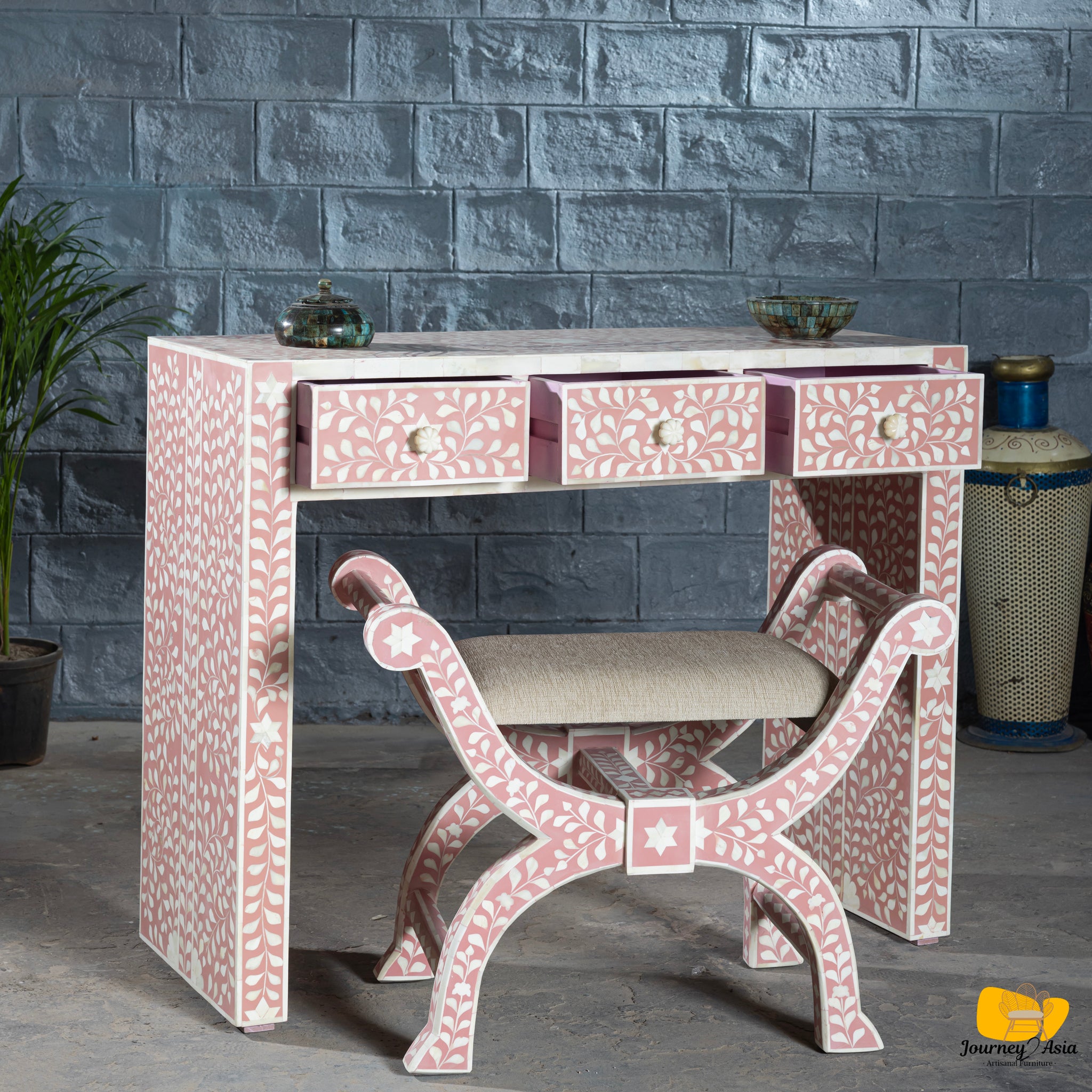 Pretty Pink Bone Inlay Vanity Table with Matching Stool