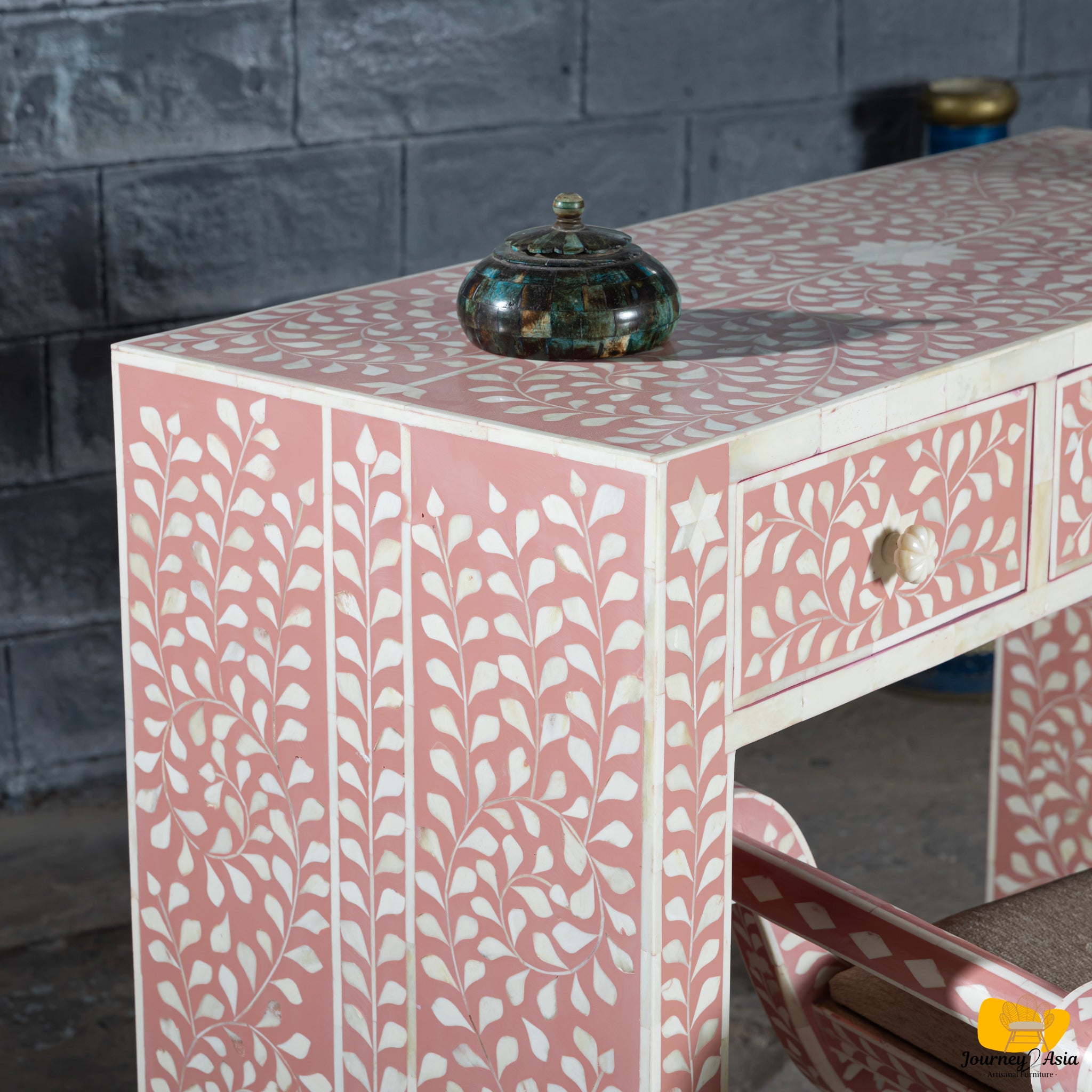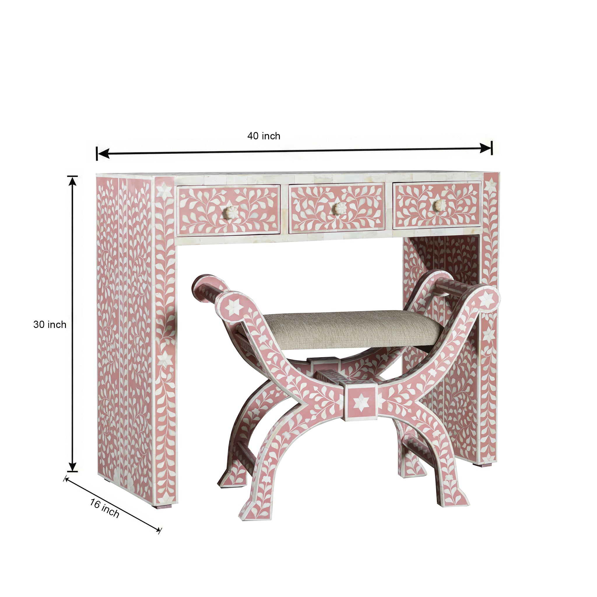Transform your dressing area into a haven of elegance with this exquisite bone inlay vanity set, featuring a beautifully handcrafted table paired with a matching stool. Adorned in a soft pink and ivory floral vine pattern, this set radiates charm, artistry, and timeless femininity.