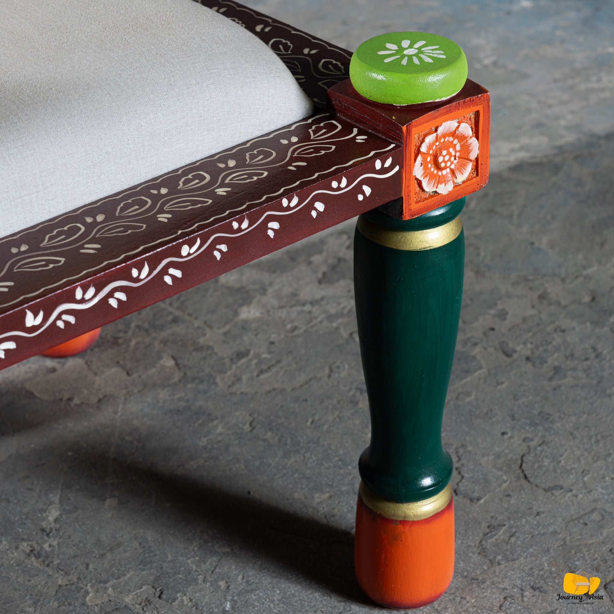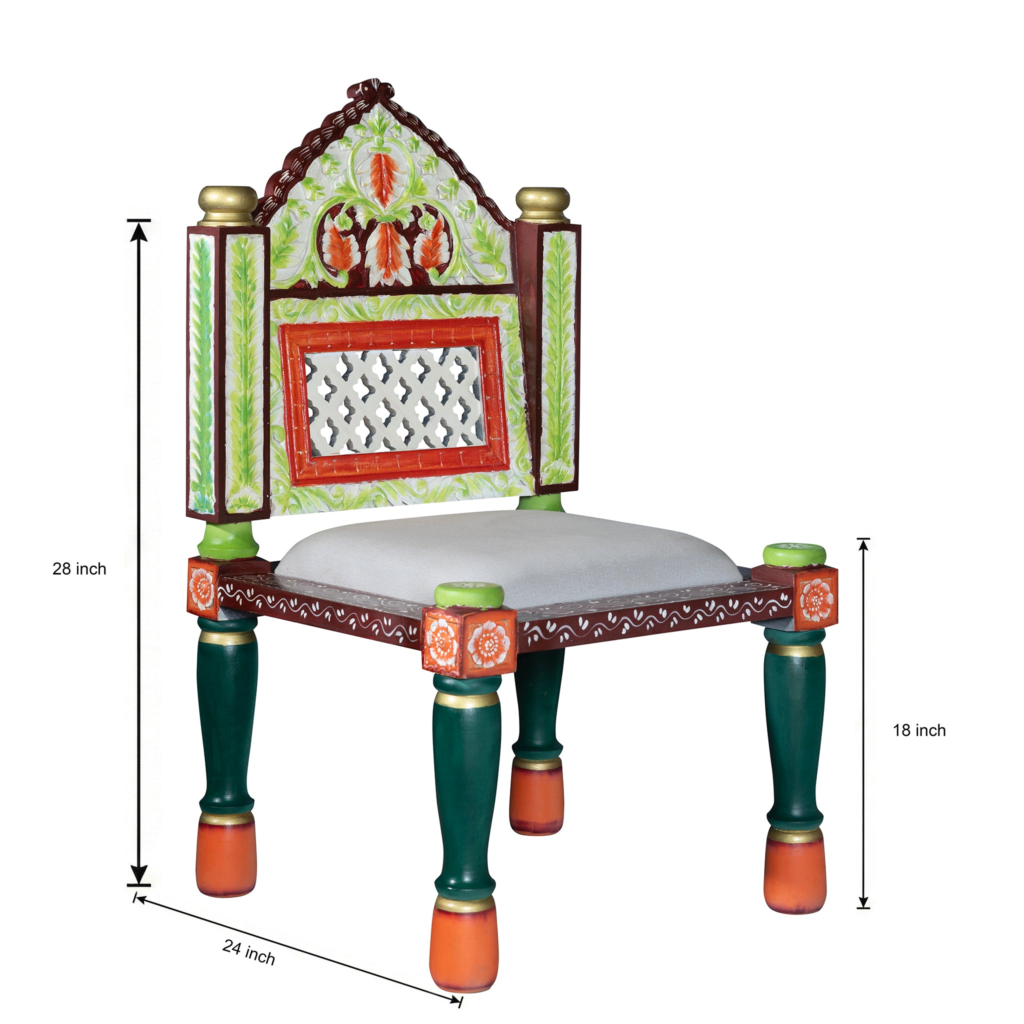 This low-seating chair - often referred to as a "Pida Chair" or "Rajasthani Bajot Chair" - originates from the western regions of India where such chairs were traditionally used in palaces, temples, and family gatherings. Known for their compact design and ornate detailing, these chairs blend comfort with decorative artistry.